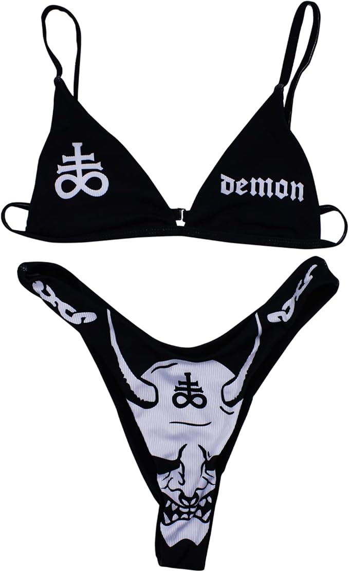 ANKOMINA Women Gothic Skull Letter Printed Two Piece Swimsuit High Cut Triangle Bikini Set for Rave Party Festival Halloween