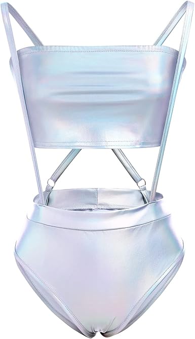 FYMNSI Women Shiny Metallic Bandeau Top + Suspender Hot Shorts Sexy Holographic Metallic Set Rave Outfit Sexy Bikini Clubwear