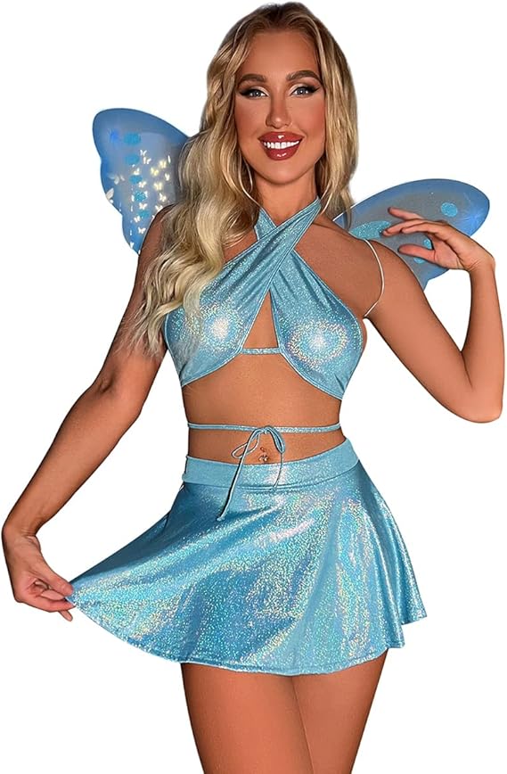 IMEKIS Women's Shiny Rave Outfit Halloween Costume Top Mini Skirt Wings Dress up Cosplay Music Festivals Clothes Set