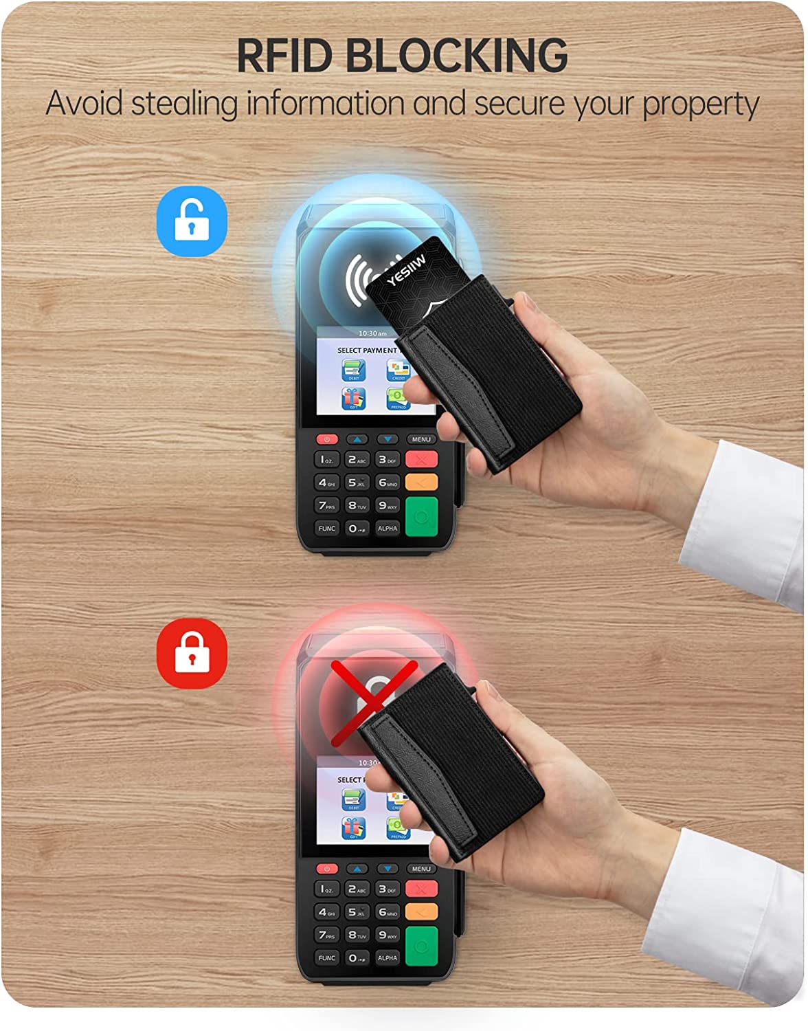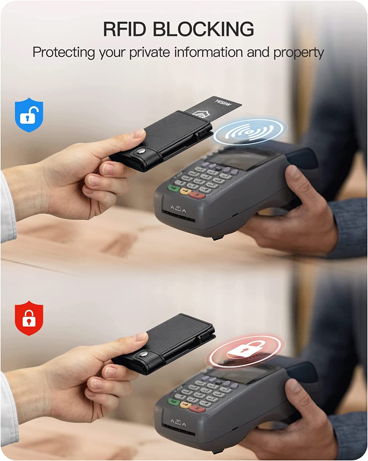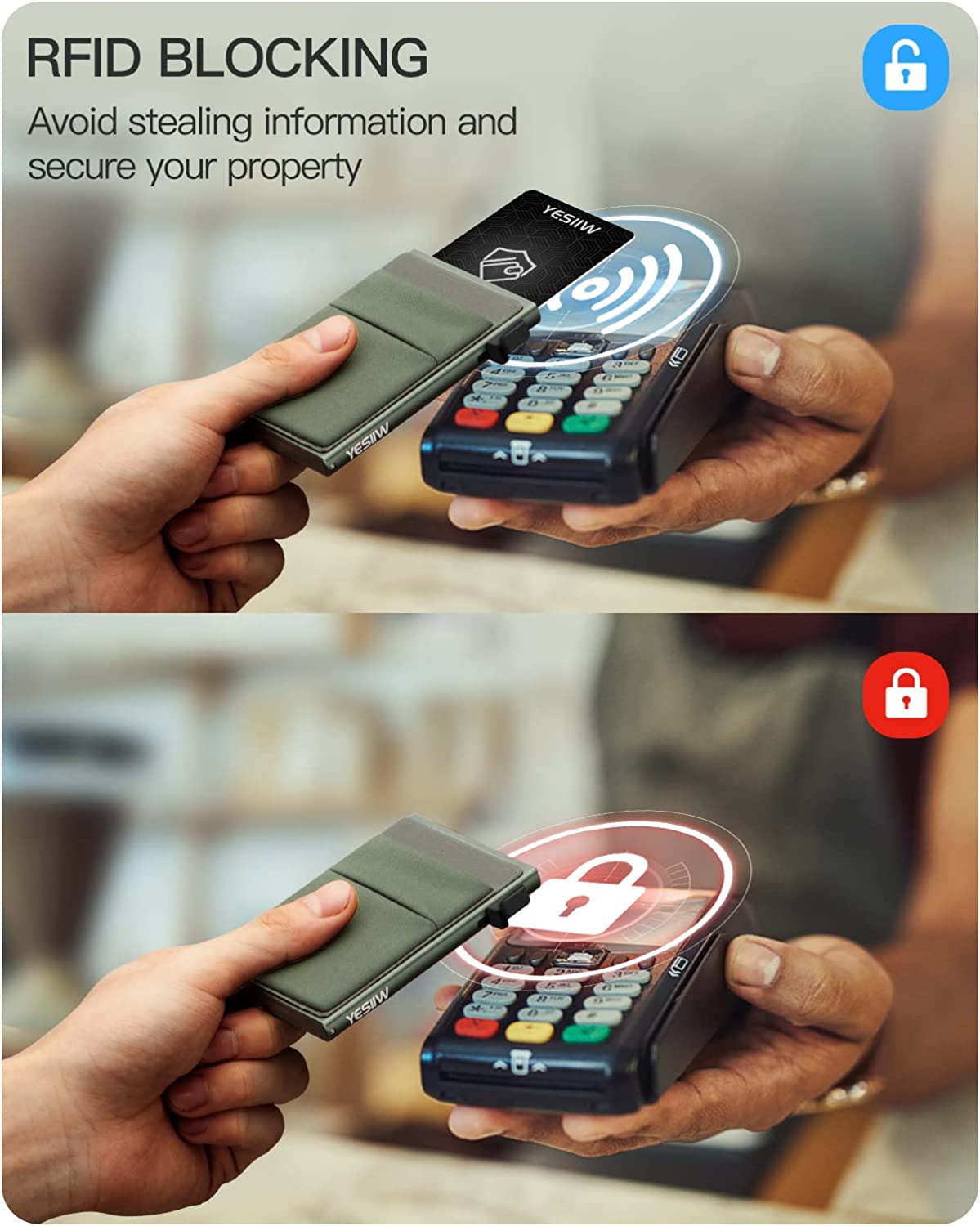 • ✅ RFID/NFC PROTECTION - Advanced aluminium builder offers the best solution for unpredictable risks from RFID/NFC scanning. and ensures thieves can’t hi-jack your credit card information. Inside strip holds cards tightly, so that your cards won't drop out even your turn the hard case upside down.