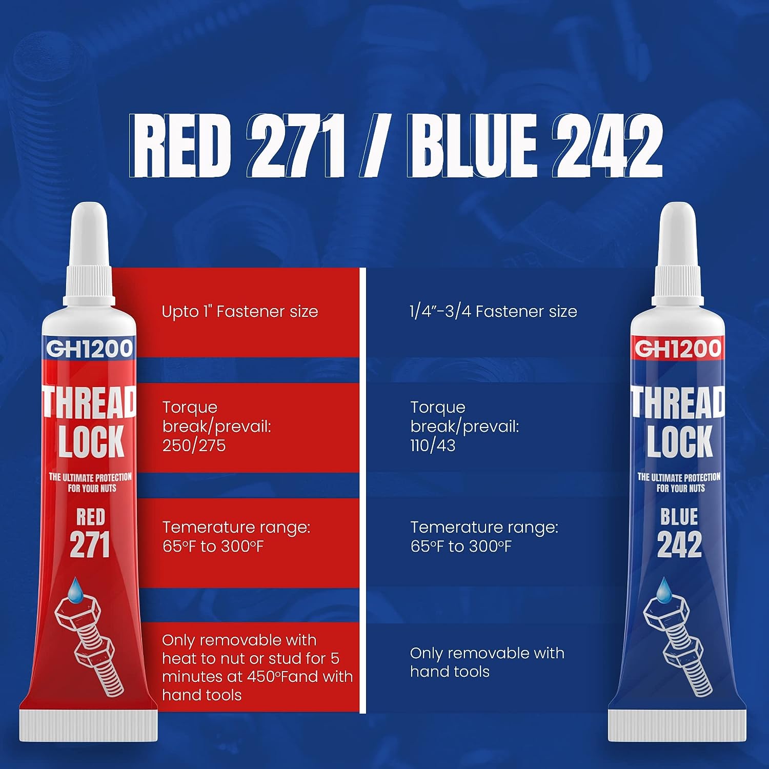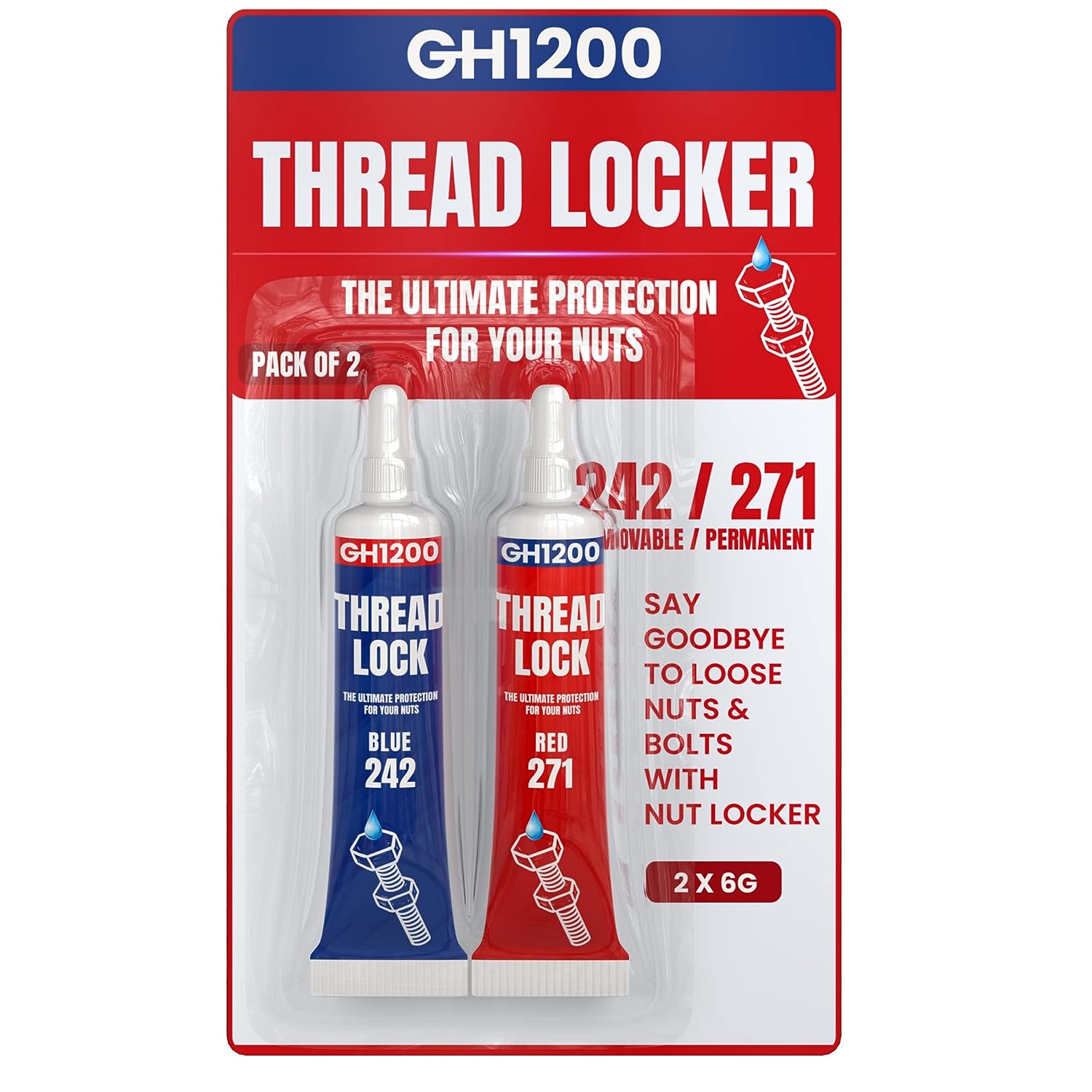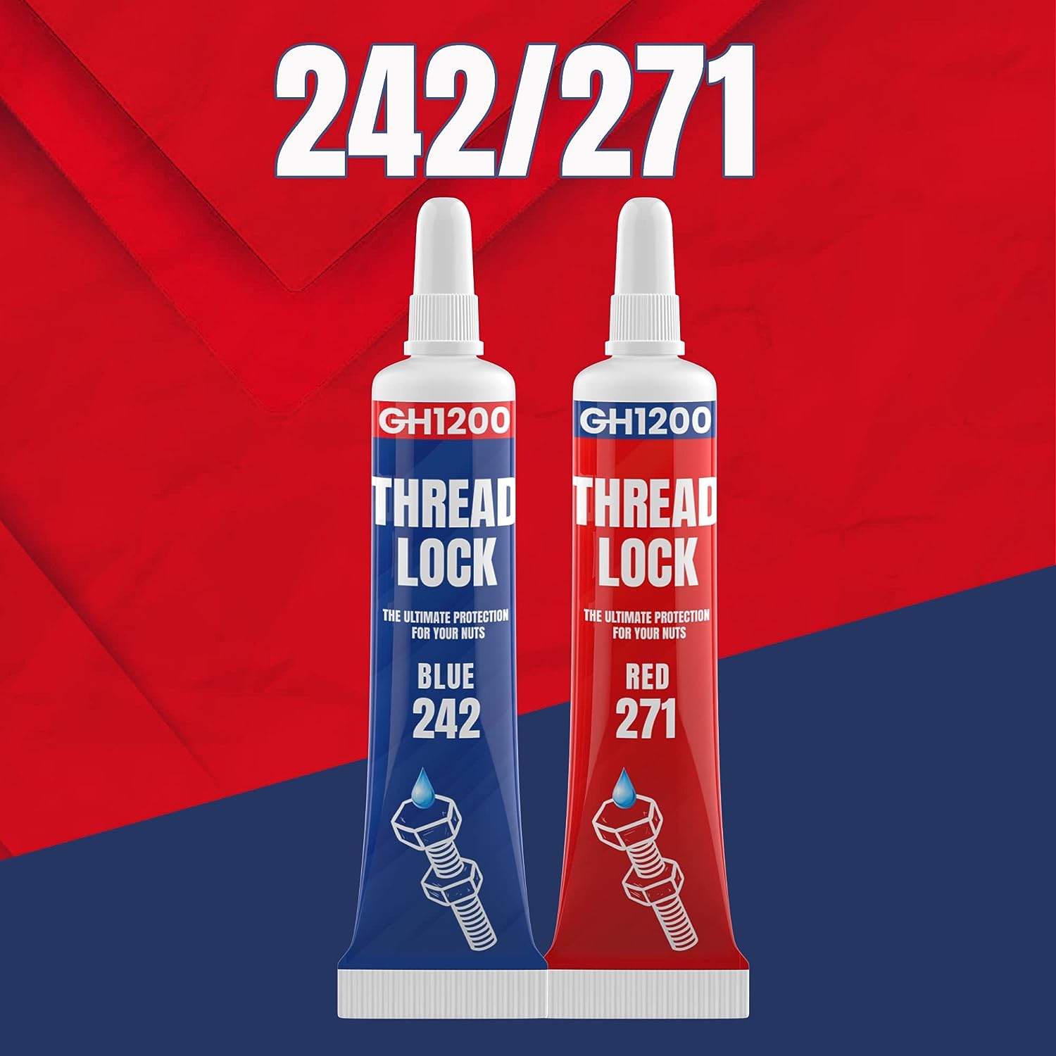 2 Pack Thread Lock. 271 and 242 Medium and Strong Strength Locktight for Nuts, Bolts, Fasteners and Metals. Lock Tight Thread Locker with Stable and Consistent Performance (6gx2) (271 +242)