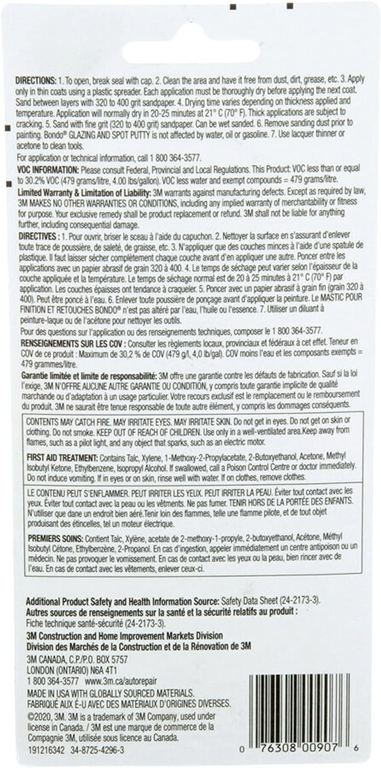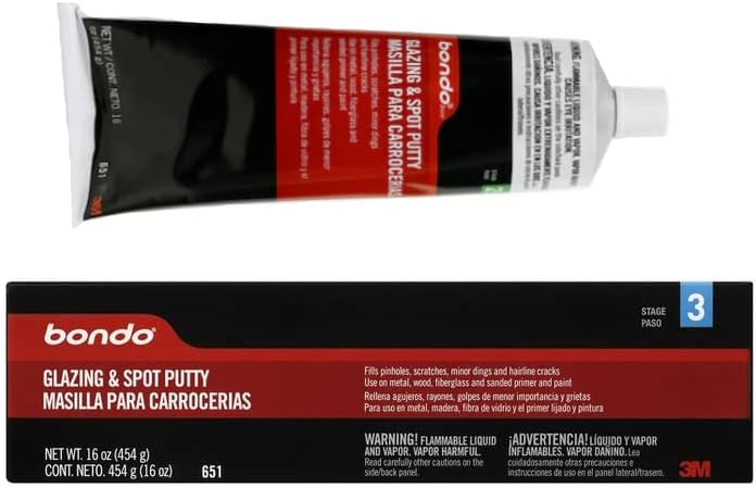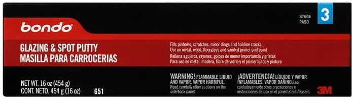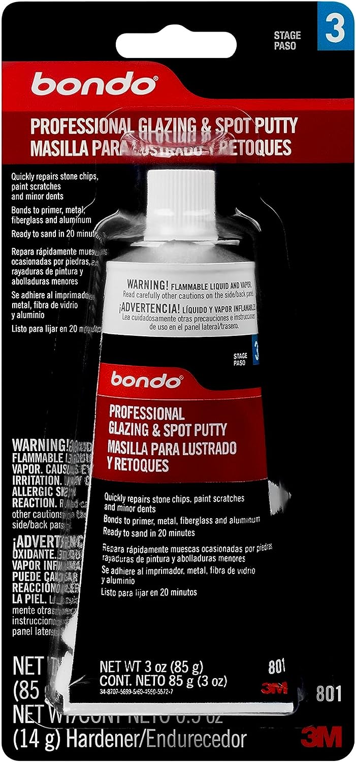 Bondo Glazing & Spot Putty is easy to use, dries fast and stays durable, ideal for filling pinholes in body filler and covering auto body scratches, paint chips and minor dings. This 1-part nitrocellulose putty dispenses easily and efficiently right from the tube with no mixing, affords a 3-minute working time and is sandable in 30 minutes for fast, efficient repairs.
