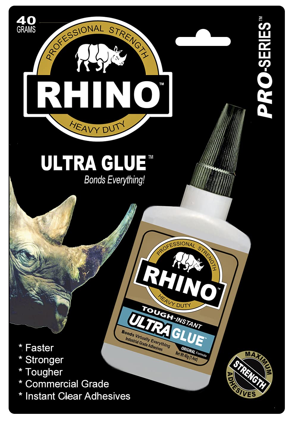 The Only Glue You'll Ever Need! Rhino Glue Pro Kit is a clear commercial grade instant adhesive that will bond virtually everything. Rhino Glue will instantly bond the same or dissimilar surfaces like hard to bond plastics, vinyls, canvas, woods, rubber, ceramics, metals, glass, fabrics and more. No more failed bonds or dry outs with our triple distilled adhesive that works on materials where others fail. Rhino toughened formula for impacts, shock, moisture, heat and vibrations. Rhino Gel is a thicker version of Rhino Glue. Unlike other gel glues that gum up our medium thick Gel will not clog or dry out. Rhino Glue Pro kit comes with a great brush on glue for edge to edge bonding and very small projects. Brush on glue is the same great formula as Rhino Glue. Read all Warnings on back label of bottle before use. Note: Not to be used on Skin or Hair. Not available in stores. Rhino Glue Pro Kit, 65 gram includes 1) Rhino Glue 40 gram 1) Rhino Glue Gel 15 gram 1) Rhino Glue 10 gram Brush on Glue with brush inside cap. Total of 65 grams of Rhino Toughened Adhesives.