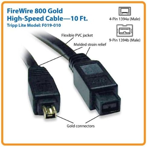 The F019-006 is a bilingual FireWire cable. It features 9-pin and 4-pin male connectors that enable you to connect a 4-pin FireWire (1394a) device to a 9-pin FireWire 800 (1394b) port on a computer, providing data transfer rates of up to 800 Mbps. The F019-006 provides true plug-and-play convenience with no complicated setup procedures required. This premium Tripp Lite cable meets all FireWire 800 and 1394b specifications, is backward compatible with original FireWire systems and devices, and is fully compatible with PC, Mac, SUN, and other IEEE-1394b equipped systems.