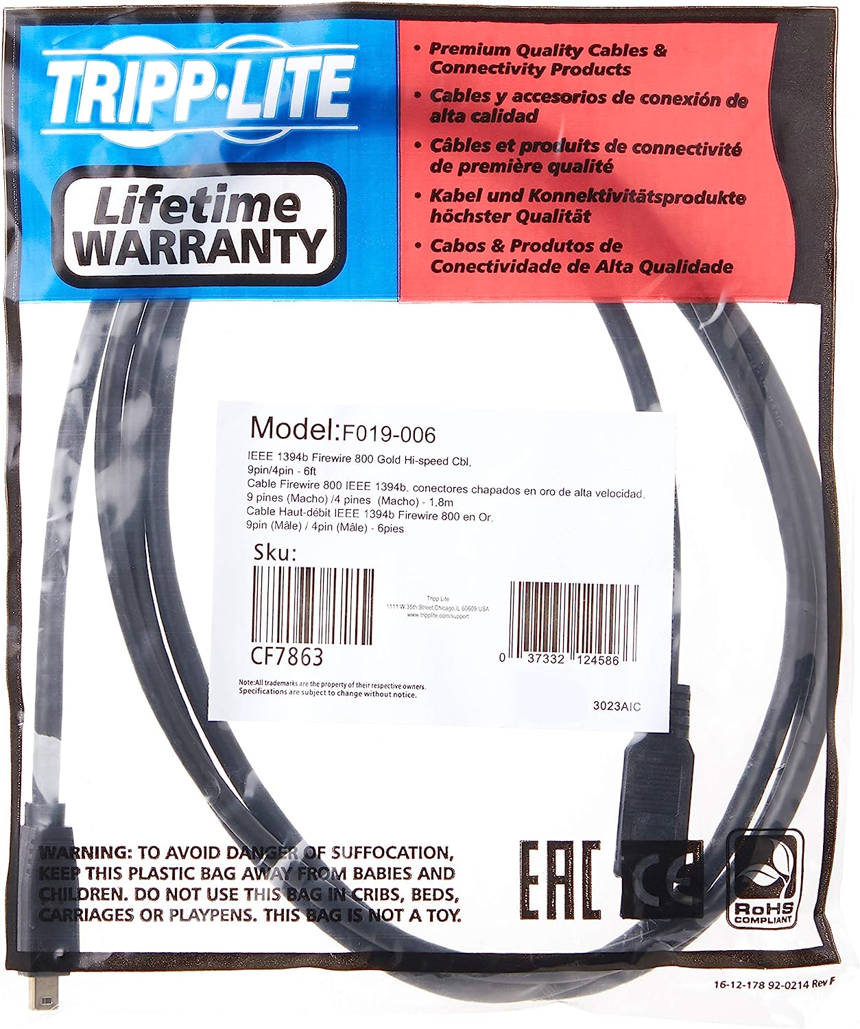 Get the lightning-fast data transfer rates you need for multimedia and other high-end applications! Tripp Lite's F019-006 Bilingual FireWire Cable lets you take advantage of the latest FireWire technology by connecting Firewire 800 devices to 1394a ports. It's ideal for use with storage systems, digital camcorders, printers, scanners, and other FireWire-enabled devices. Premium triple shielding and gold-plated connectors insure that you get the speed you expect from FireWire. And we back our pledge of quality with a lifetime product warranty.