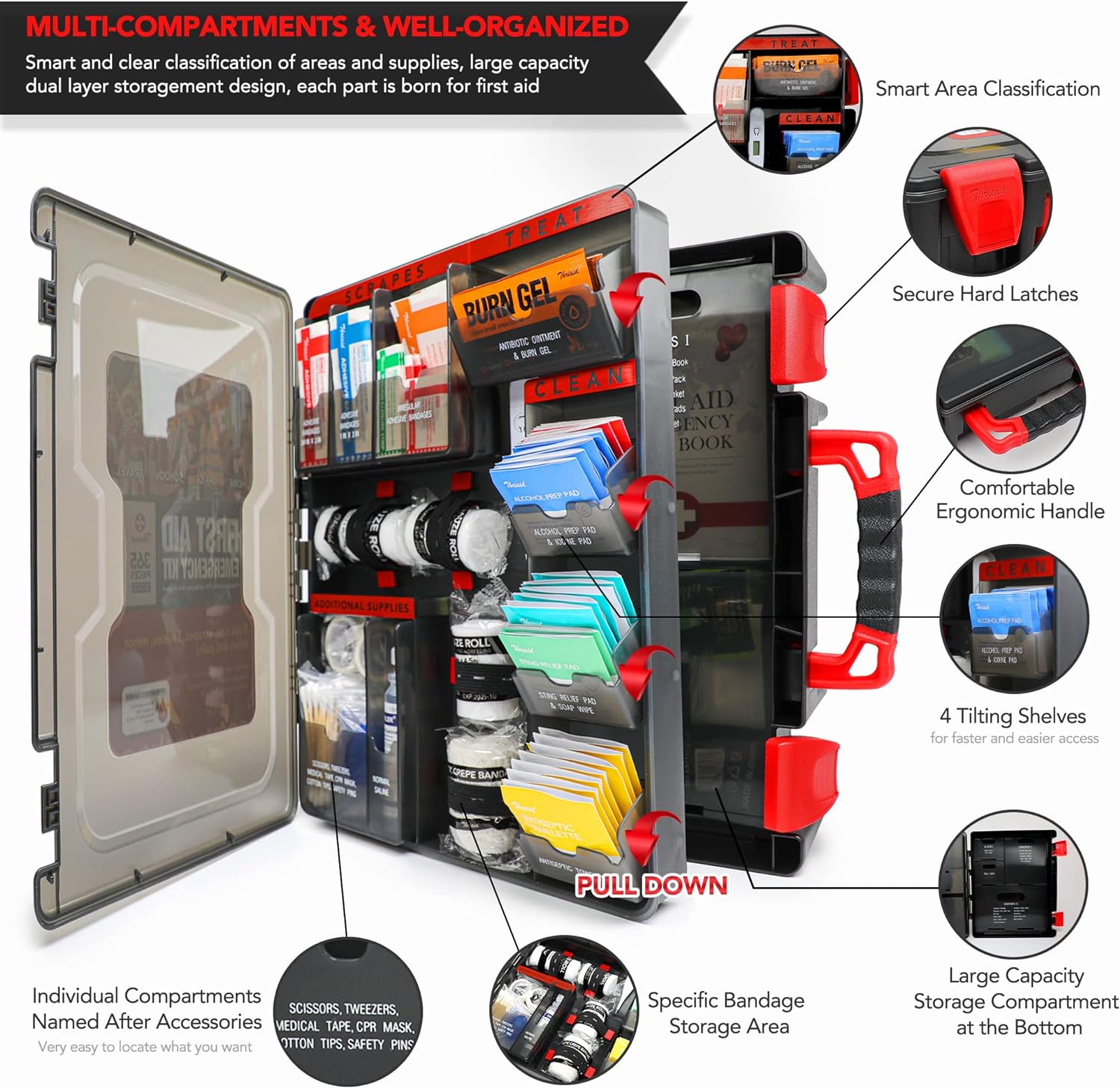 • MULTI-COMPARTMENTS & WELL-ORGANIZED ▶ Dual layer high-capacity design, well-organized multi-compartments named after accessories assortment, tilting shelves, transparent lid and safety latches, specific gauze roll storage area, and more. Help you find what you want more efficiently, fight for precious rescue time in sudden major injuries without any panic combined with the product description and usage methods in the first aid handbook.