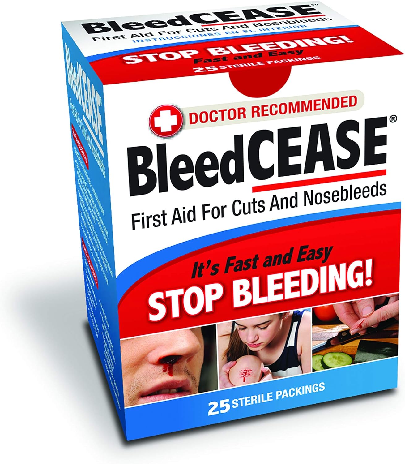 BleedCEASE STERILE PACKINGS BleedCEASE's natural fiber releases calcium, a clotting factor, upon contact with blood. The calcium accelerates the clotting process and continues to be released until the bleeding has stopped. It's effective not only for nosebleeds, but on everyday cuts and scrapes; shaving cuts; puncture wounds; lacerations; and sports injuries, enabling you to return quickly to your activities. For nosebleeds, simply insert a BleedCEASE sterile packing into the bleeding nasal cavity and remove after thirty minutes. For cuts or wounds, place it directly on the bleeding wound and apply pressure with two fingers until bleeding has stopped. The unique fiber of each sterile packing is highly absorbent. Unlike some blood clotting products, BleedCEASE works without stinging or irritating the affected area. The unique fiber of each sterile packing is highly absorbent. BleedCEASE does not stick to or disturb the wound upon removal. New clots are not torn triggering new bleeding. BleedCEASE is the natural based bio-polymer calcium alginate. BleedCEASE has no known side effects or medication contraindications, and is suitable for all ages.