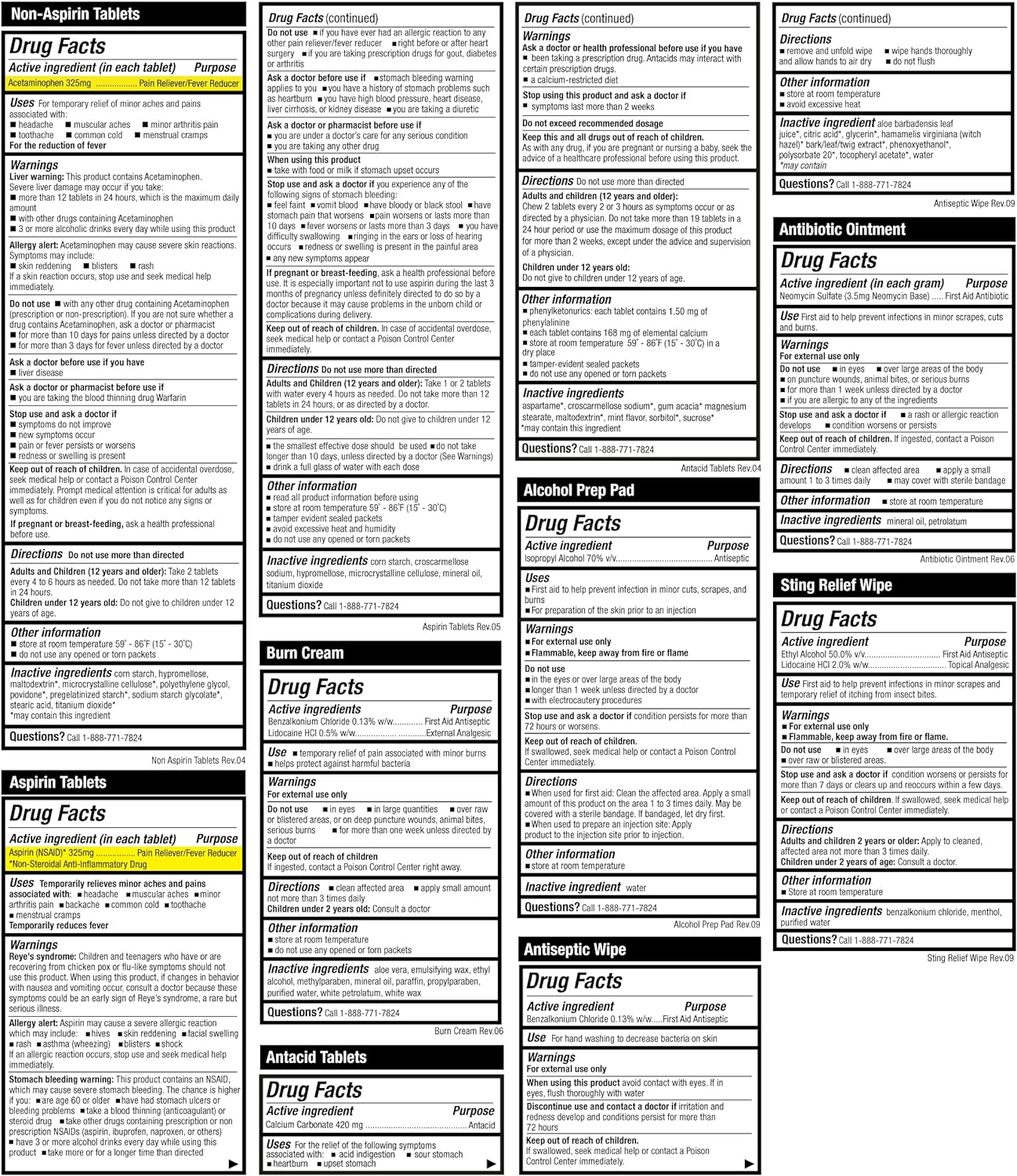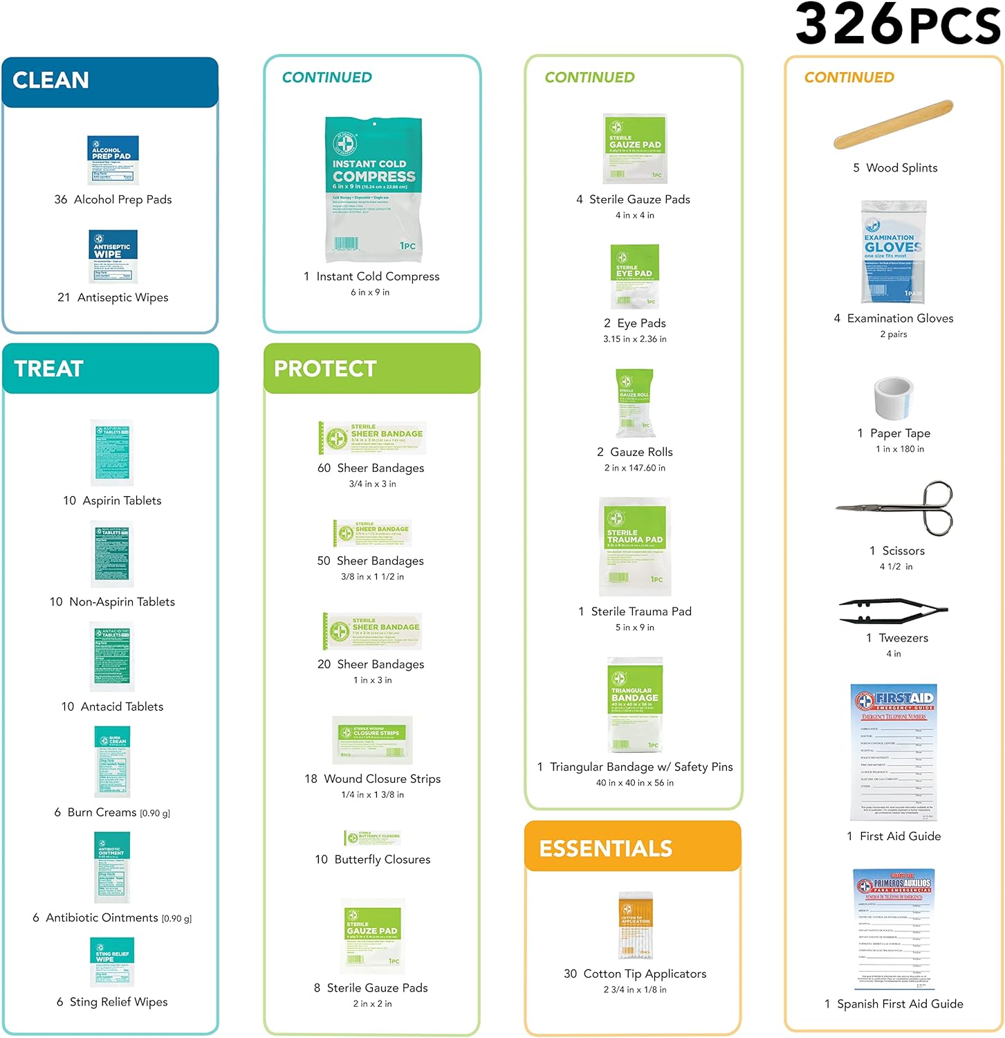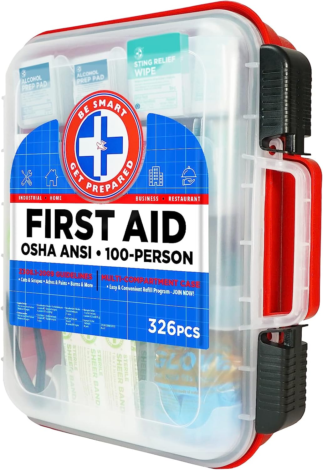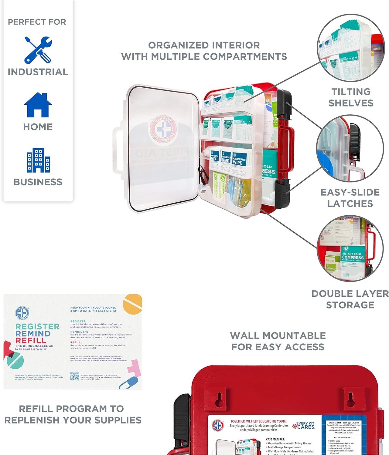 Manufactured by the #1 leading manufacturer of First Aid Kits in the USA. The Be Smart Get Prepared First Aid Kit complies or exceeds all OSHA guidelines for small business and meets ANSI types I and II 2009 requirements for small business of 100 people. Packaged in a durable, high density plastic case, this kit features conveniently organized multi-compartments, tilting shelves, clear lid cover, sliding lock latches and exceed the requirements necessary for your family or co-workers to feel safe and secure. It can be carried around for portability or mounted on a wall in a central location. Ideal for home, school, office, restaurant, daycare or recreation. You can Be Smart and Get Prepared all day, every day. From the leading and trusted company Total Resources International. This multi-purpose First Aid Kit includes: - CLEAN - 21 Antiseptic Towelettes 36 Alcohol Prep Pads 6 Sting Relief Pads- TREAT - 6 Ointment Packets 6 Burn Cream Ointments 10 Antacid Tablets 10 Aspirin Tablets 10 Non-Aspirin Tablets 1 Instant Cold Compress 6" x 9" 1 English First Aid Guide 1 Spanish First Aid Guide- PROTECT - 20 Adhesive Bandages 1" x 3" 50 Adhesive Bandages 3/8" x 1-1/2" 60 Adhesive Bandages 3" x 3/4" 10 Butterfly Closures Bandages 18 Wound Closure Strips 1/4" x 1-1/2" 2 Gauze Rolls 2" x 4.1 yards 2 Eye Pads 8 Sterile Gauze Pads 2" x 2" 4 Sterile Gauze Pads 4" x 4" 1 Sterile Trauma Pad 5" x 9"- ADDITIONAL SUPPLIES - 30 Cotton Tip Applicators 1 Adhesive Tape Roll 1" x 5 yards 5 Finger Splints 1 Triangular Bandage 40" x 40" x 56" 1 Tweezers 1 Metal Scissor 4 Nitrile Examination Gloves
