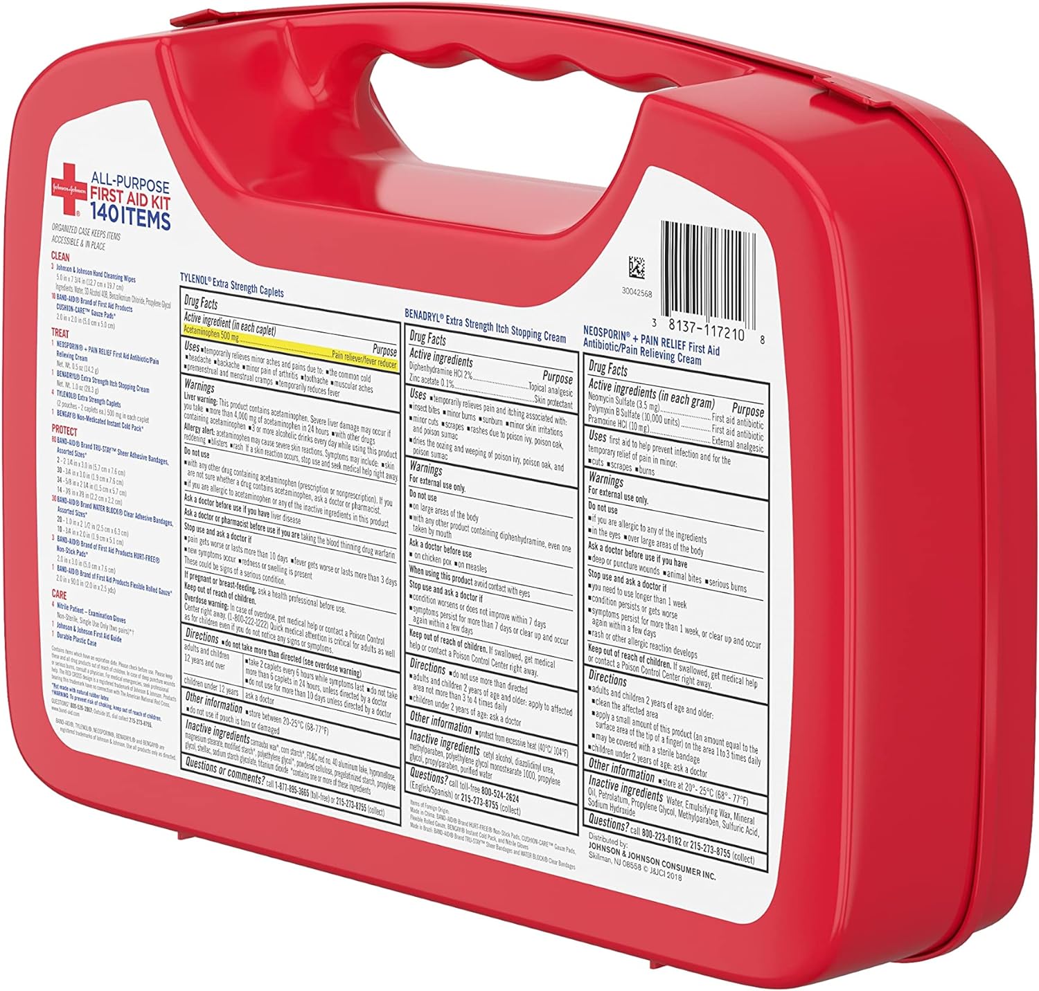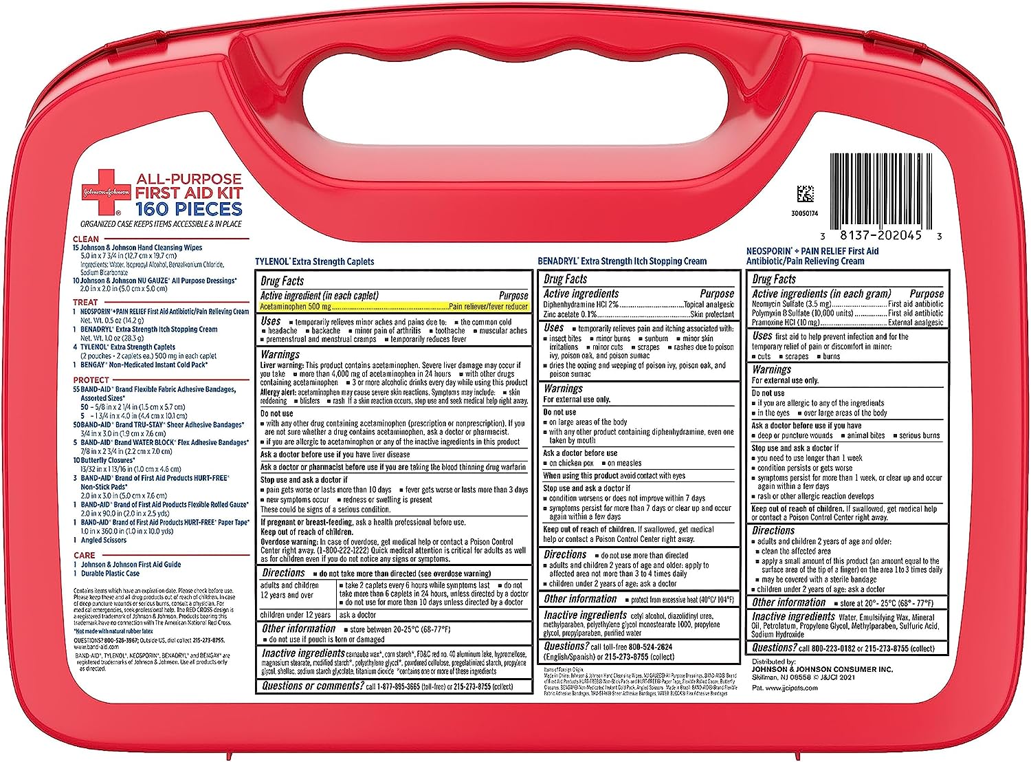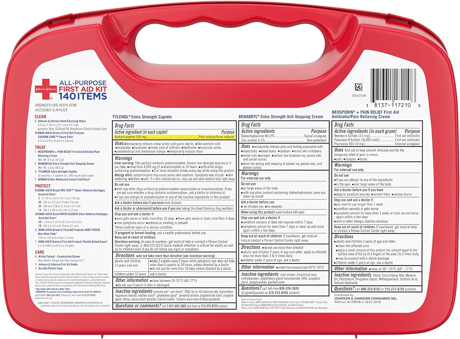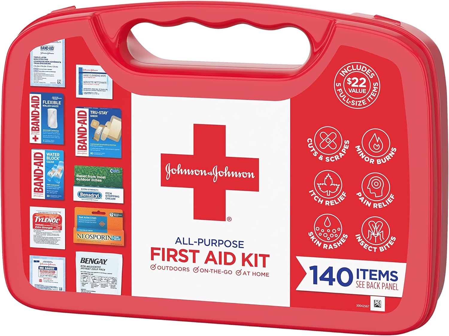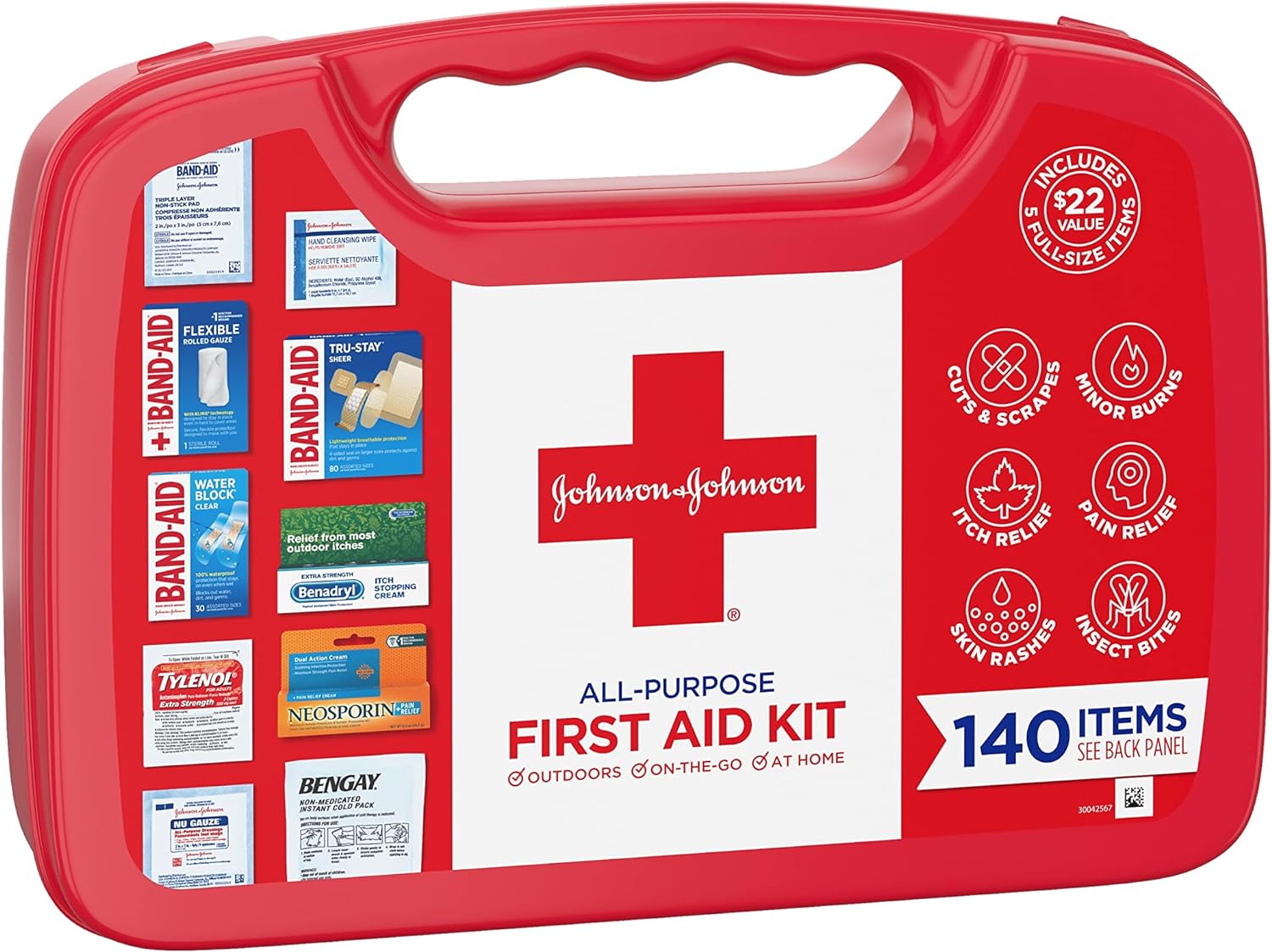 Care for minor cuts, scrapes and burns with the Johnson & Johnson All Purpose Compact First Aid Kit. This emergency first aid kit contains essential first aid supplies including cleansing wipes, gauze pads, assorted bandages, rolled gauze, antibiotic cream, itch stopping cream, acetaminophen caplets, an instant ice pack, and more. This portable first aid kit contains products from leading, doctor-recommended brands, including Band-Aid Brand Adhesive Bandages, Neosporin, Tylenol, Bengay and Benadryl. It also includes a first aid guide and a durable, plastic box to keep items accessible and organized. This #1 selling branded first aid kit is for use anywhere - perfect for use at home, in a dorm, in the car and on-the-go, or for camping and other outdoor activities. First aid kit offers a great value by saving you over $8 vs. average retail price for the included first aid supplies.