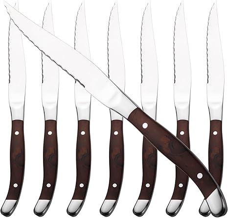 Alata Bakelite Wooden 8-Piece Steak Knives Set, Stainless Steel Steak Knife set with Serrated Edge, Razor-Sharp, Full-Tang Construction, Dishwasher Safe