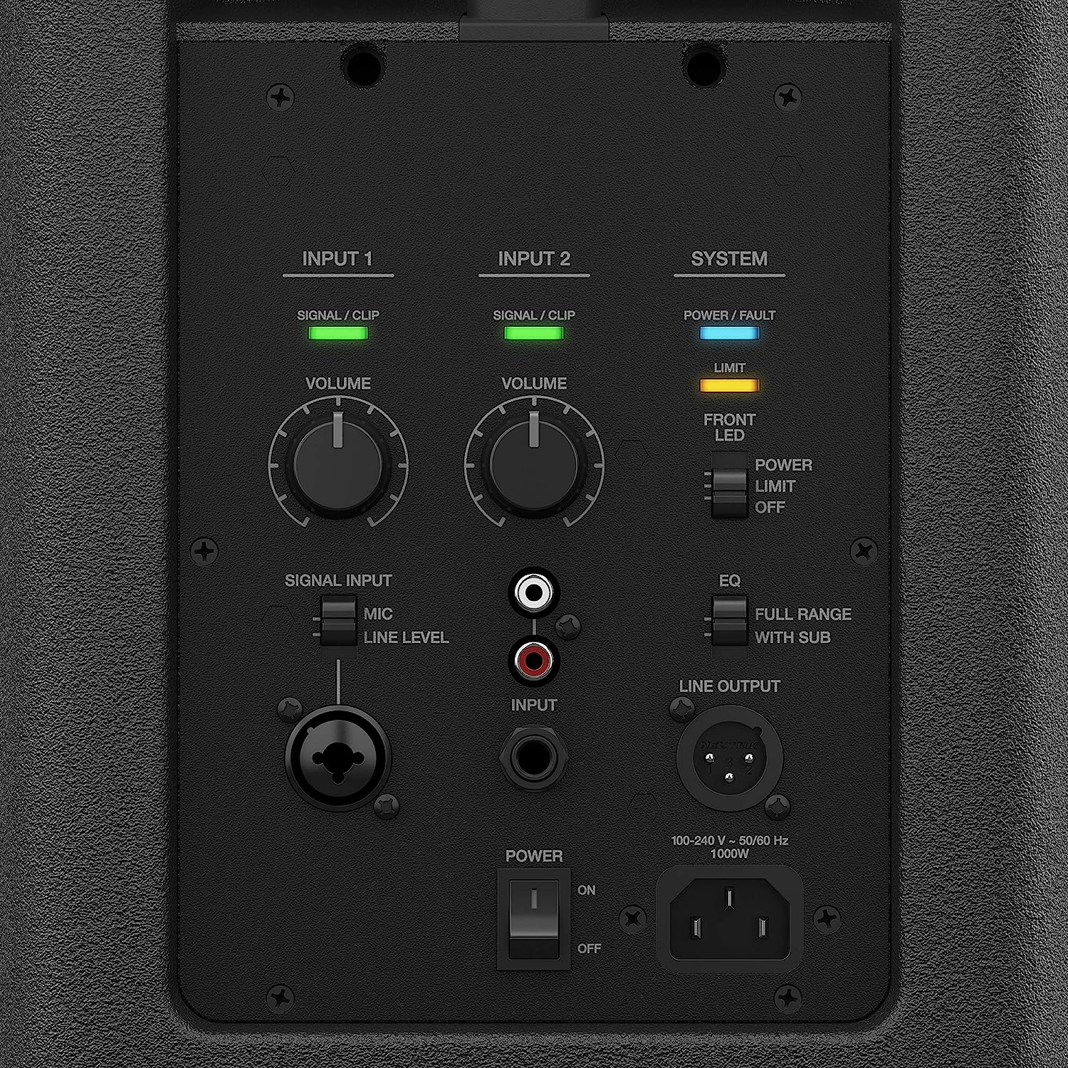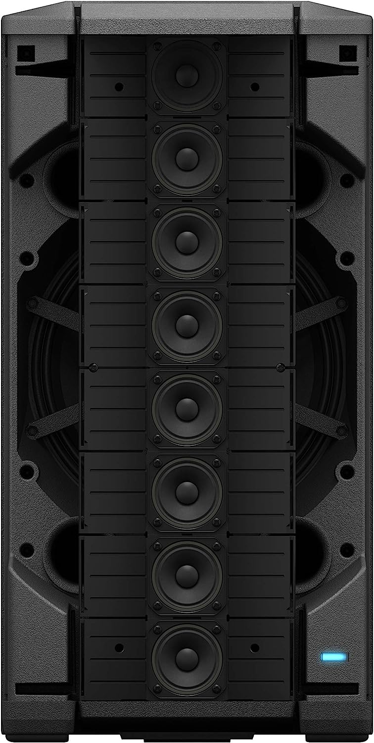 • 2 input channels with independent volume controls and Line Level/Mic switch on Channel 1 | Wide, consistent coverage from an 8-driver mid/high line array, with each driver mounted on a custom 100° waveguide