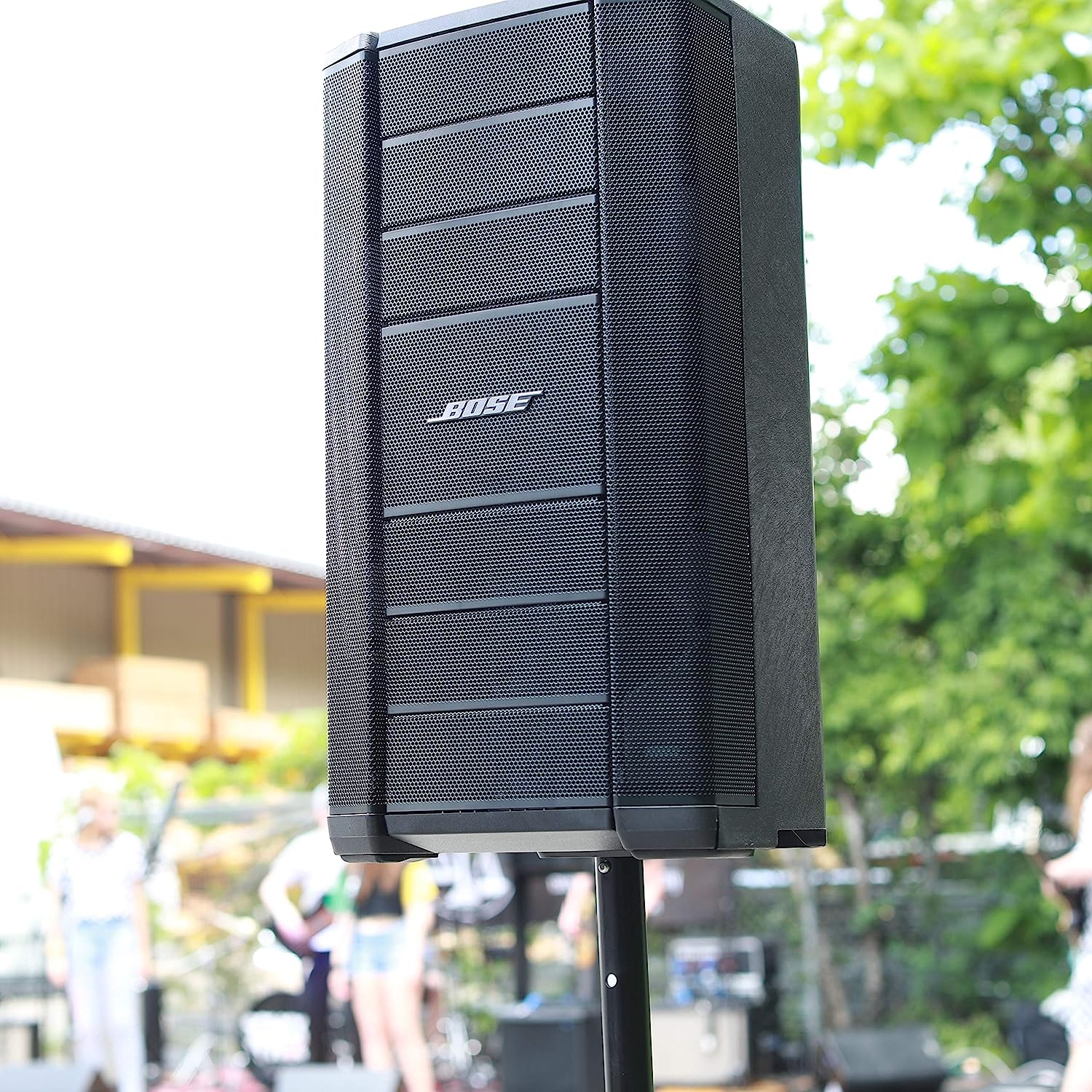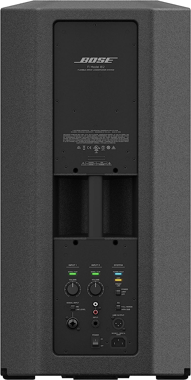 The Bose F1 Model 812 Flexible Array Loudspeaker is the first powered portable loudspeaker that lets you control its vertical coverage pattern. Simply push or pull the array into position to create “Straight,” “C,” “J” or “Reverse J” coverage patterns. And once set, the system automatically changes the EQ to maintain optimum tonal balance for each coverage pattern. So whether you’re playing at floor level, on a stage, or facing raked seats or bleachers, you can now adapt your PA to match the room. If you want extended bass response, simply add the Bose F1 Subwoofer (sold separately). It packs all the power of a larger bass box into a more compact design that’s easier to carry and fits in a car. A mounting stand for the loudspeaker is integrated right into the body of the subwoofer, so you always know where it is, making setup fast and easy. Maximum SPL @ 1 m - 132 dB SPL (peak). Frequency response (-3 dB) is 52 Hz - 16 kHz