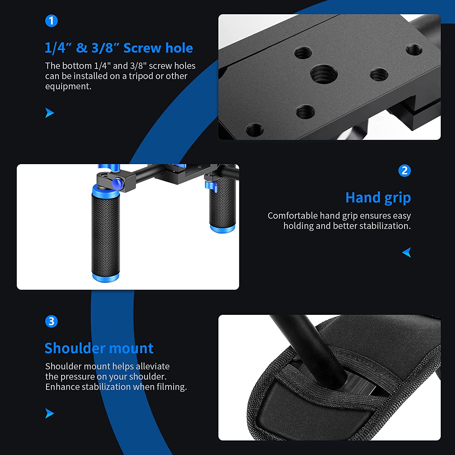 • 【Comfortable Handles & Shoulder Pad】 Dual hand grips are convenient for handheld shooting. The curved shoulder pad reduces the pressure on your shoulder and enhances stability