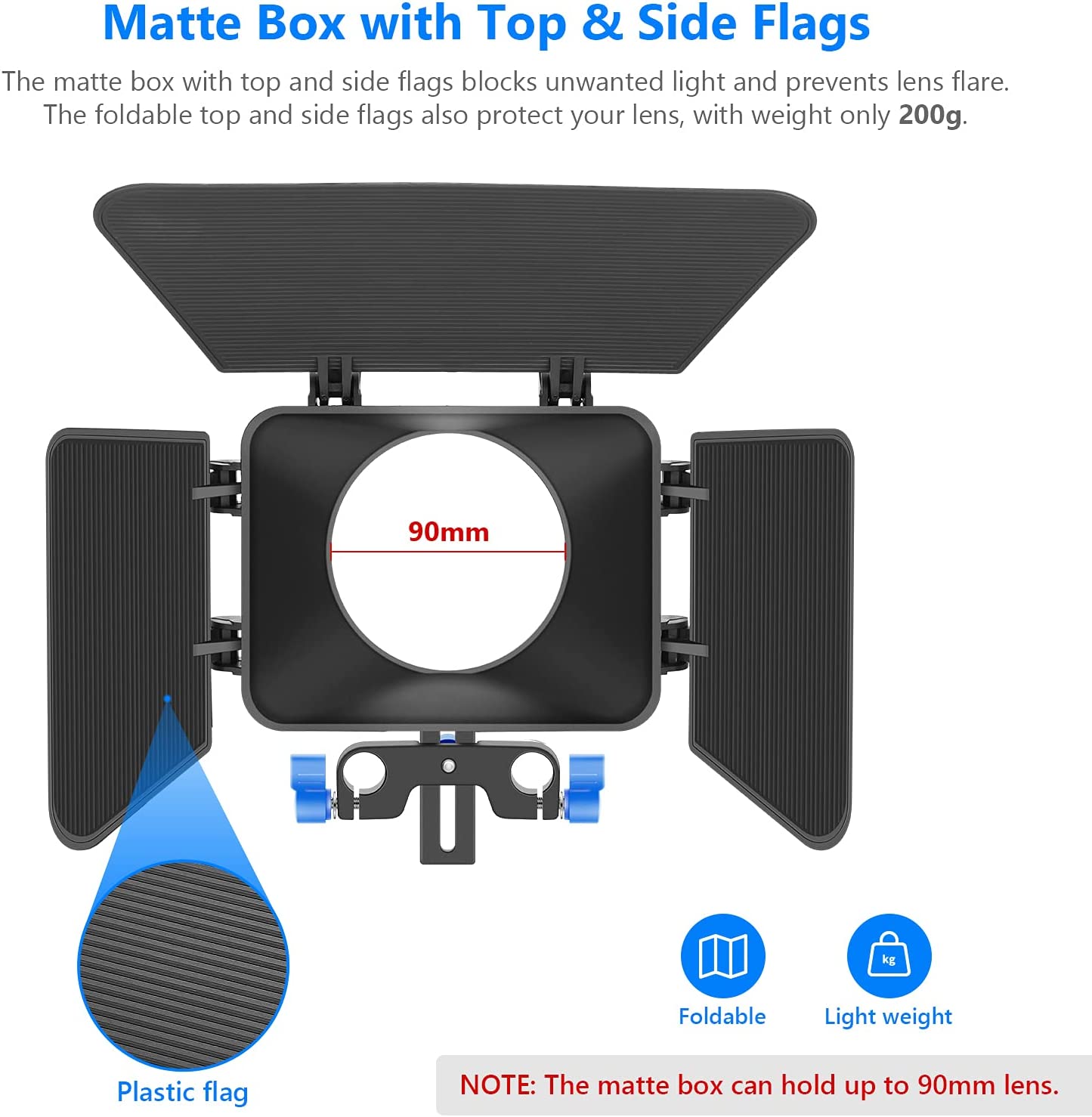 • 【Matte Box with Top & Side Flags】 The matte box with top and side flags blocks unwanted light and prevents lens flare. The foldable top and side flags also protect your lens, giving you more peace of mind