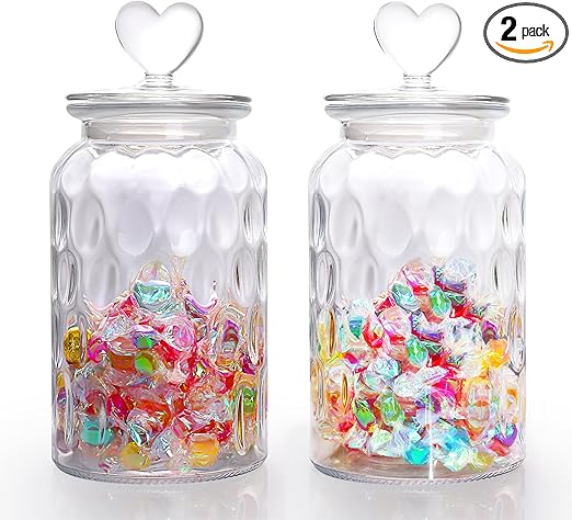 45 oz Clear Glass Heart Shaped Jars, Cute Candy Jars with Heart shaped Airtight Lids, Decorative Glass Canisters with Airtight Lids for Candy Cookie, Drops / 2 Packs