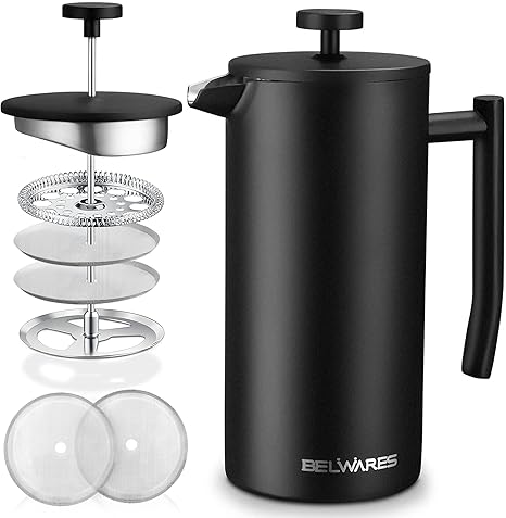 Belwares French Press Coffee Maker 50oz (1.5 Liter) | Stainless Steel 304 | Double Wall | 4 Level Filtration System | Black