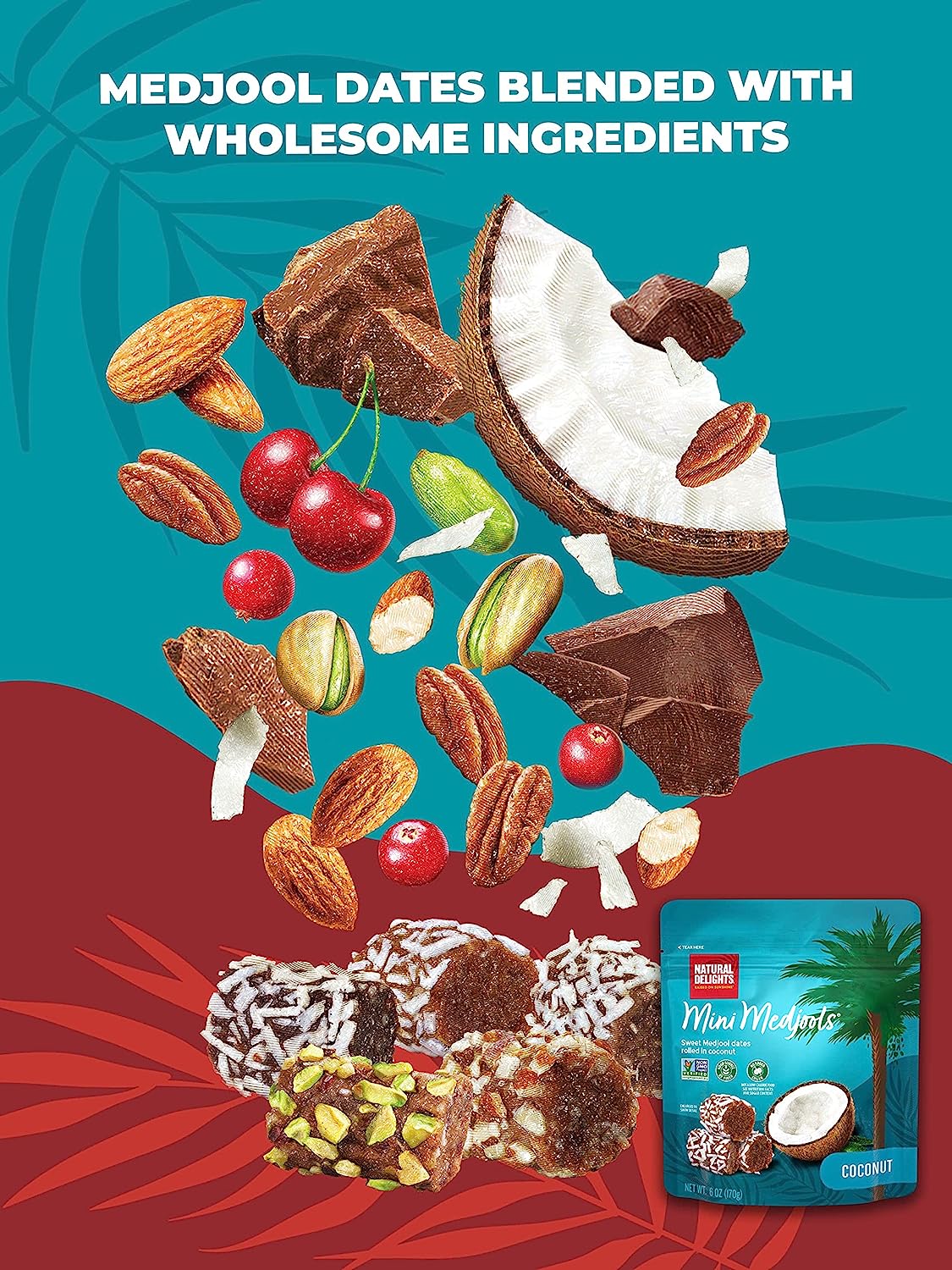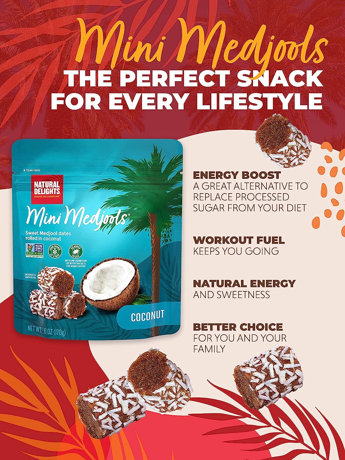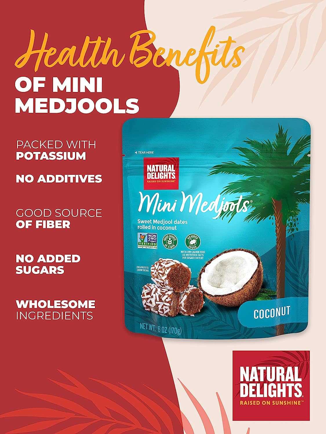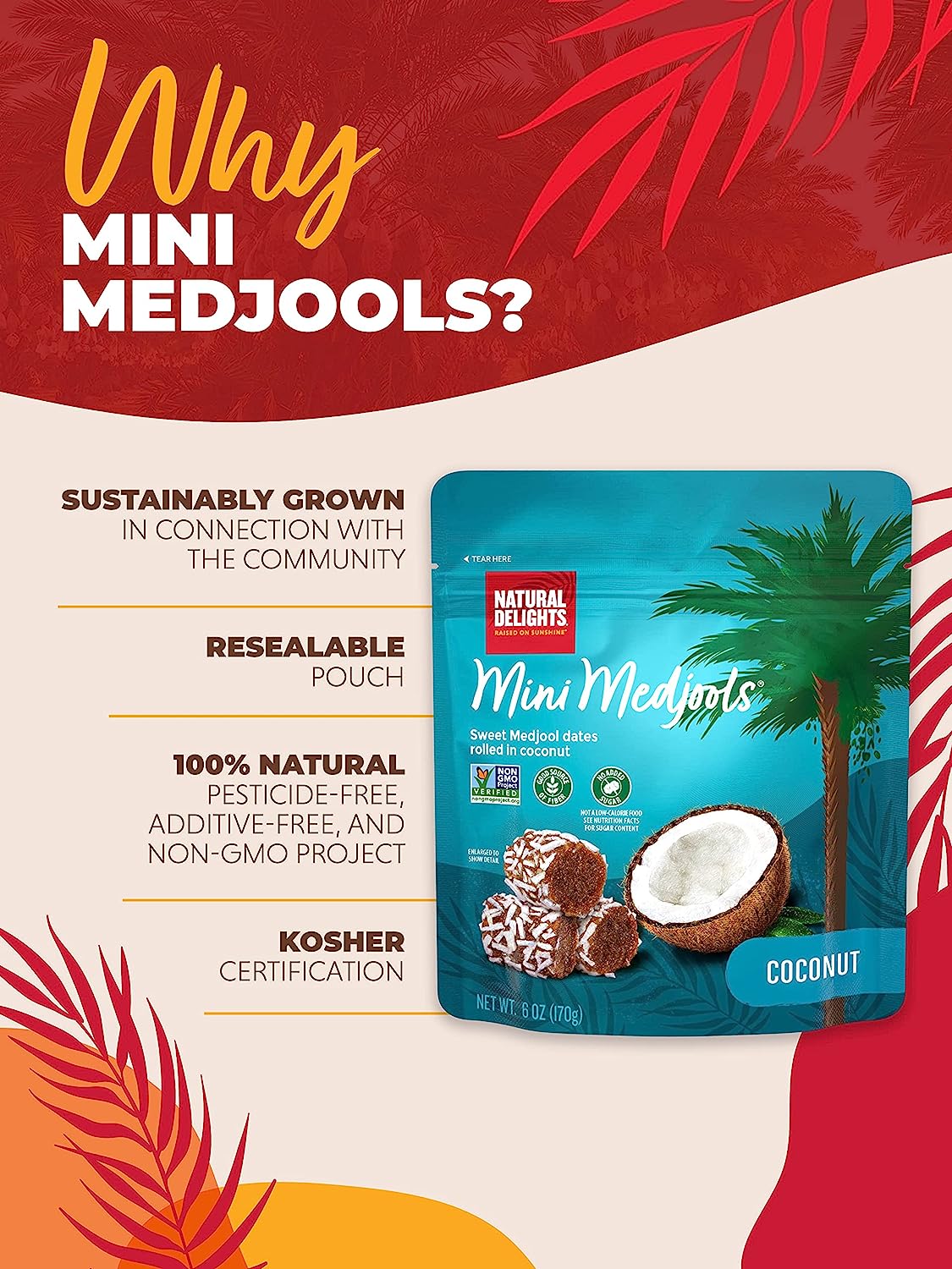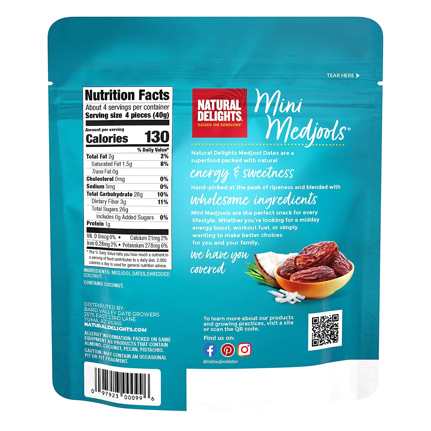 Natural Delights Medjool Dates - Coconut Mini Medjools, Non-GMO Verified, Mini Date Bites, Healthy Date Snack, Good Source of Fiber, Naturally Sweet, On the Go Snack - Coconut Mini Medjools, 6 oz Bag