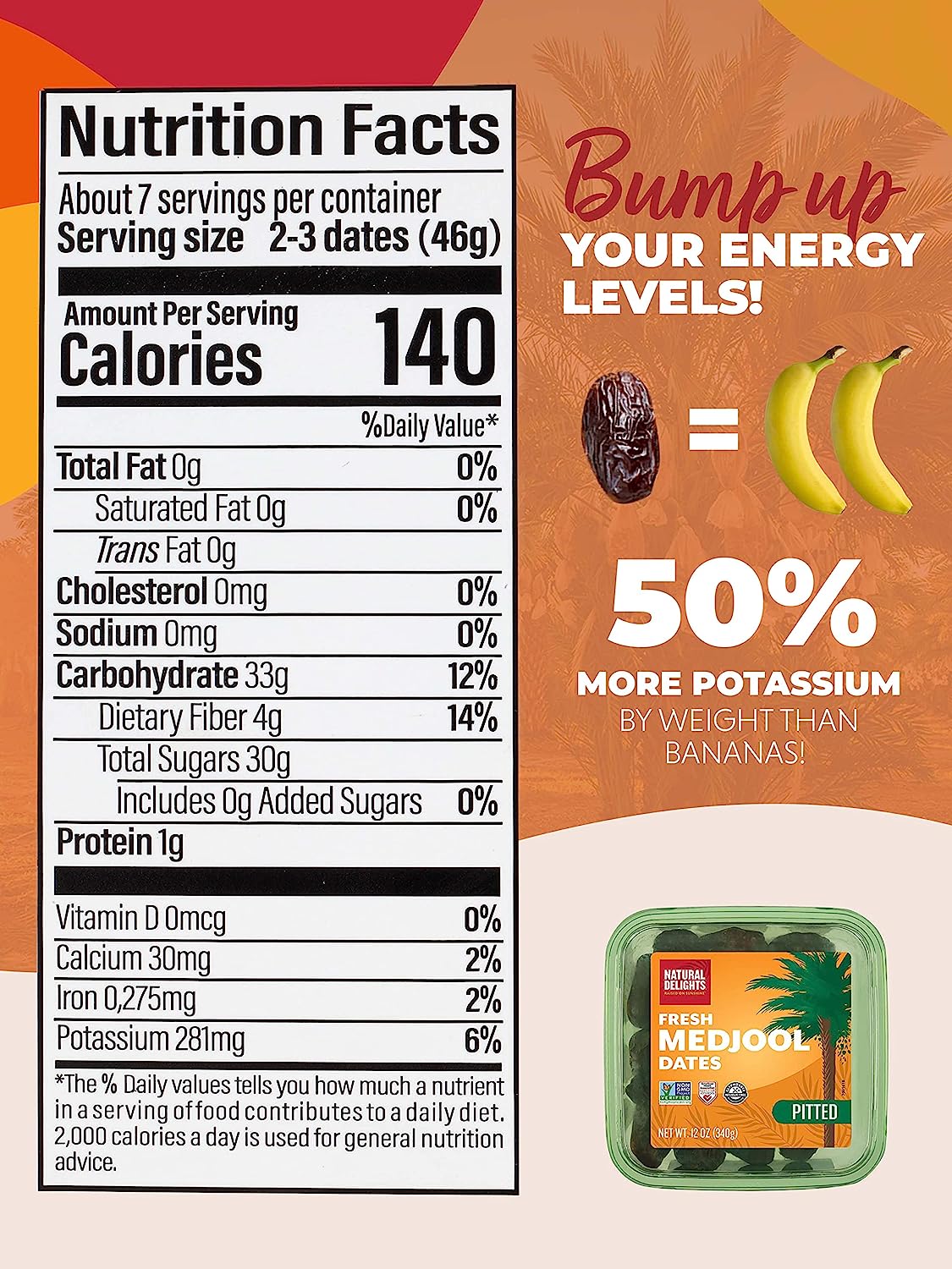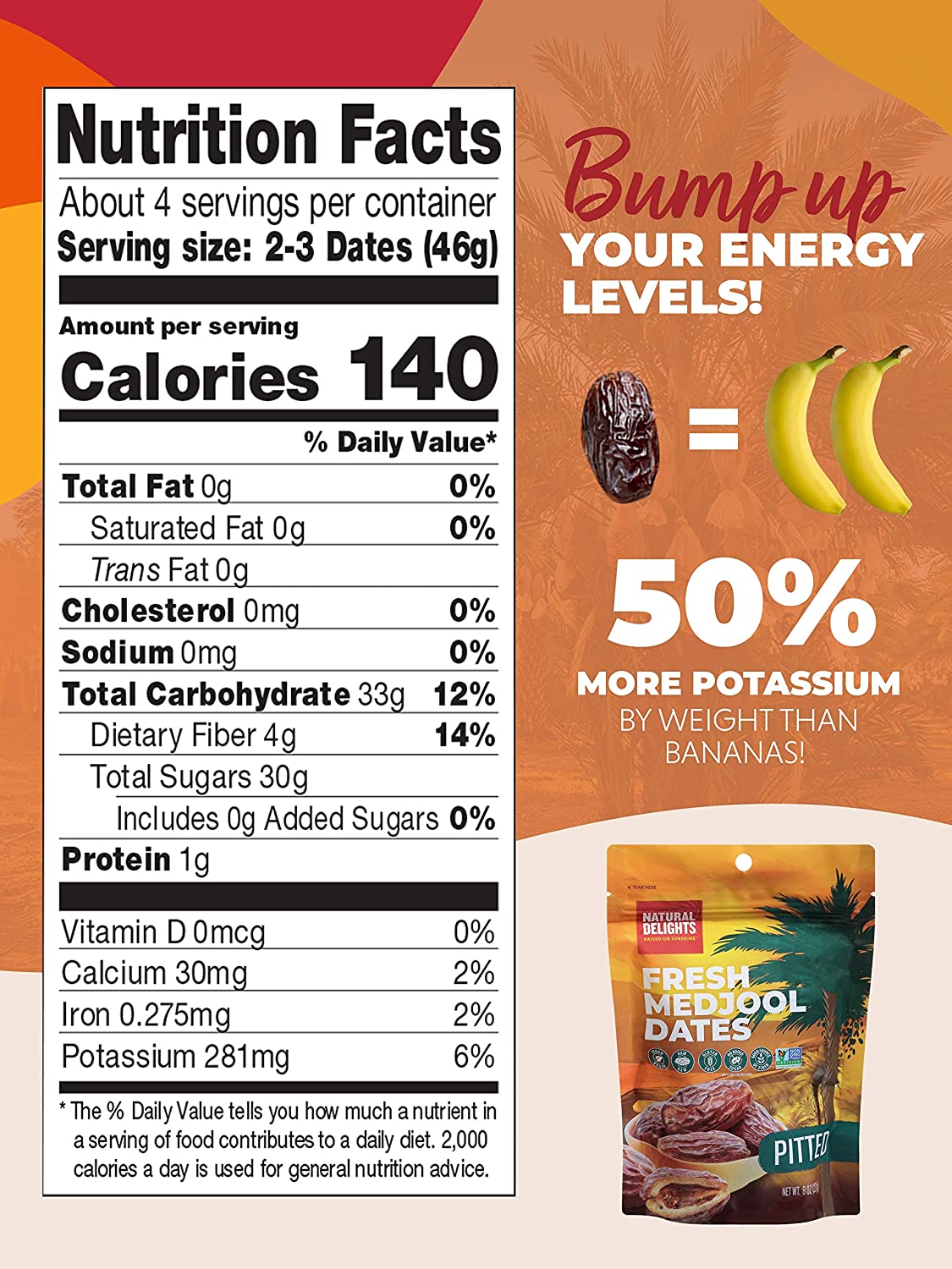 ✔ CONTAINS KEY DAILY NUTRIENTS — Dates are low in fat and packed with nutrients like potassium (50% more by weight than a banana!), copper, magnesium, niacin, and calcium.