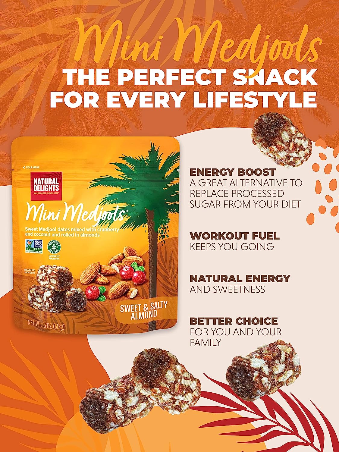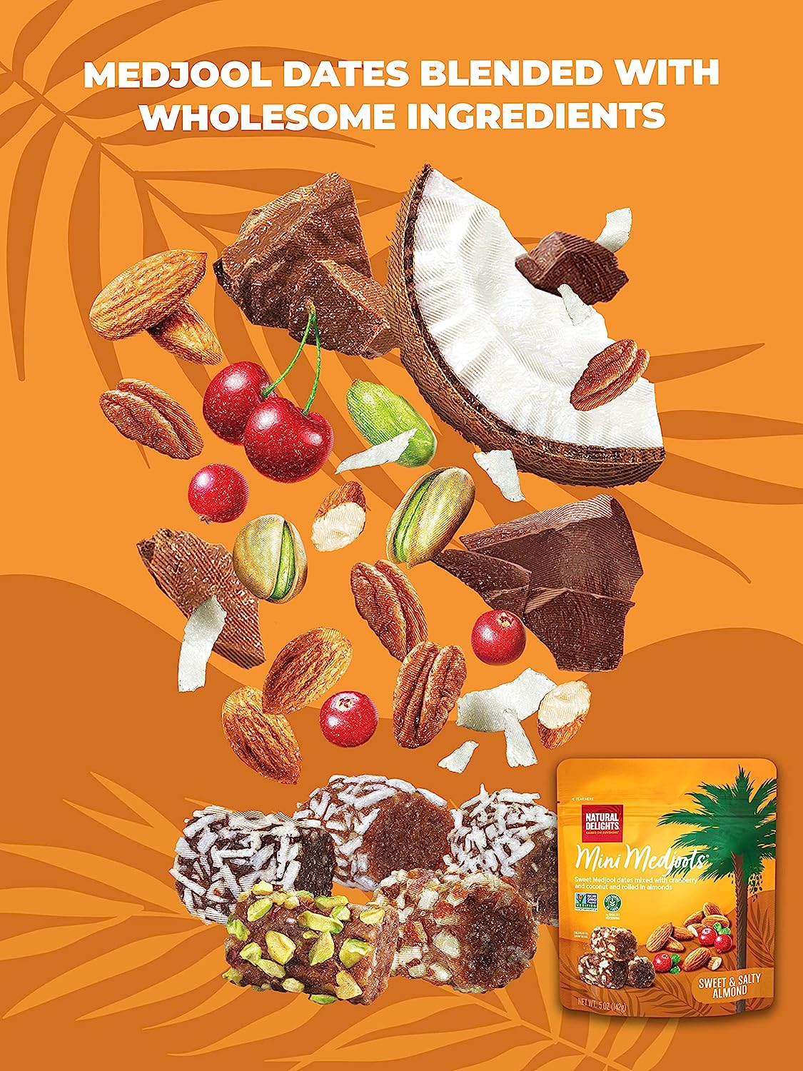 Natural Delights Medjool Dates - Mini Date Rolls with Almond, Non-GMO Verified, Healthy Mini Date Nut Rolls, Good Source of Fiber, On the Go Snack - Sweet & Salty Almond Mini Medjools, 5 oz Bag