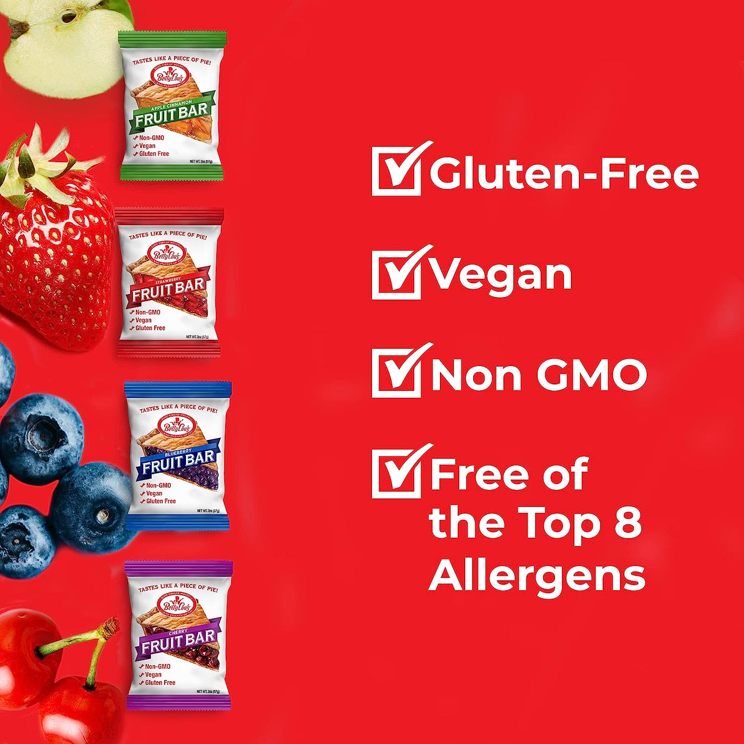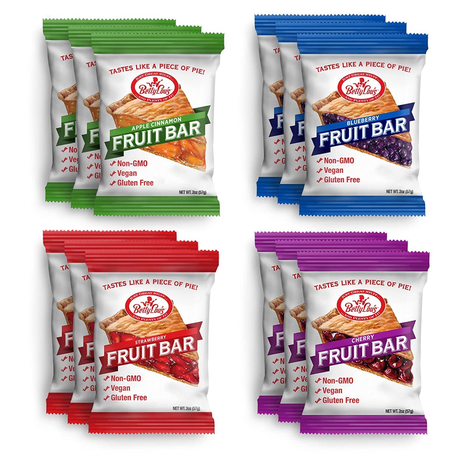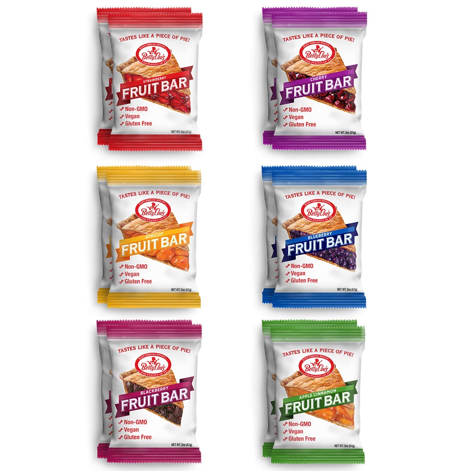 Betty Lou's Fruit Bars | Variety Pack of 12 | Gluten Free, Vegan, Non GMO | Deliciously Healthy Snacks Made with All Natural Fruit & Fruit Juice | Individually Wrapped, 2 oz. Each