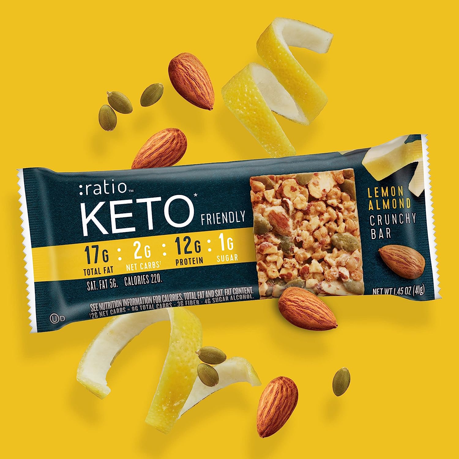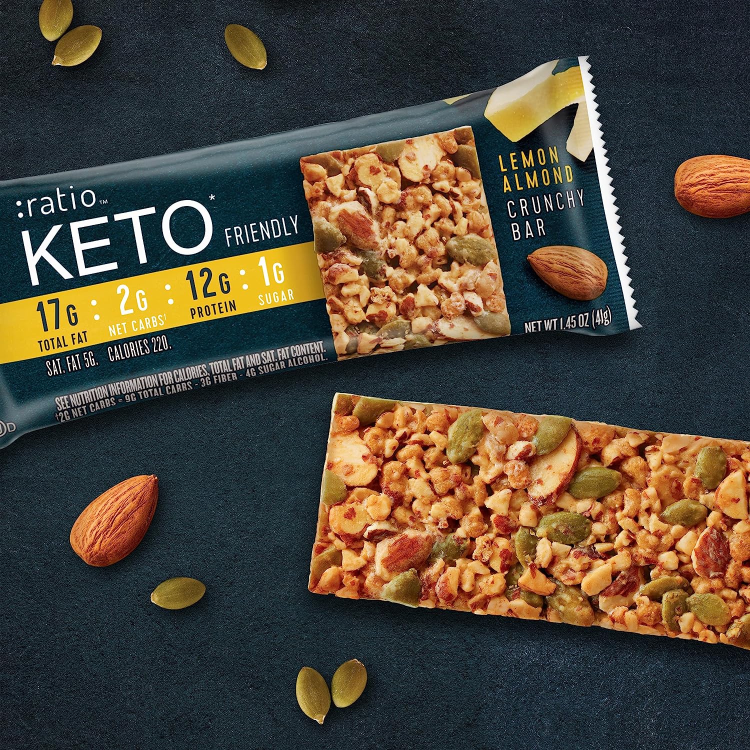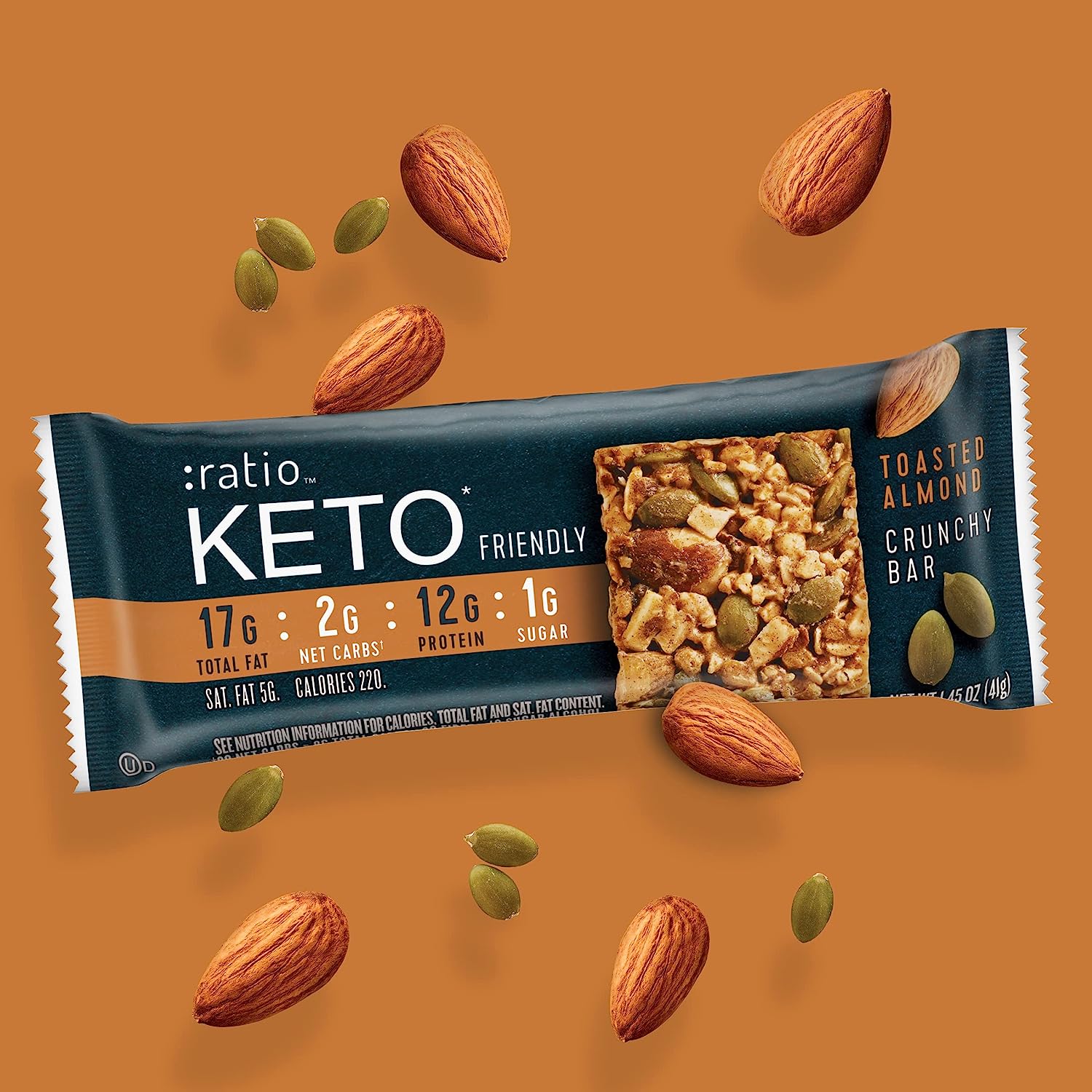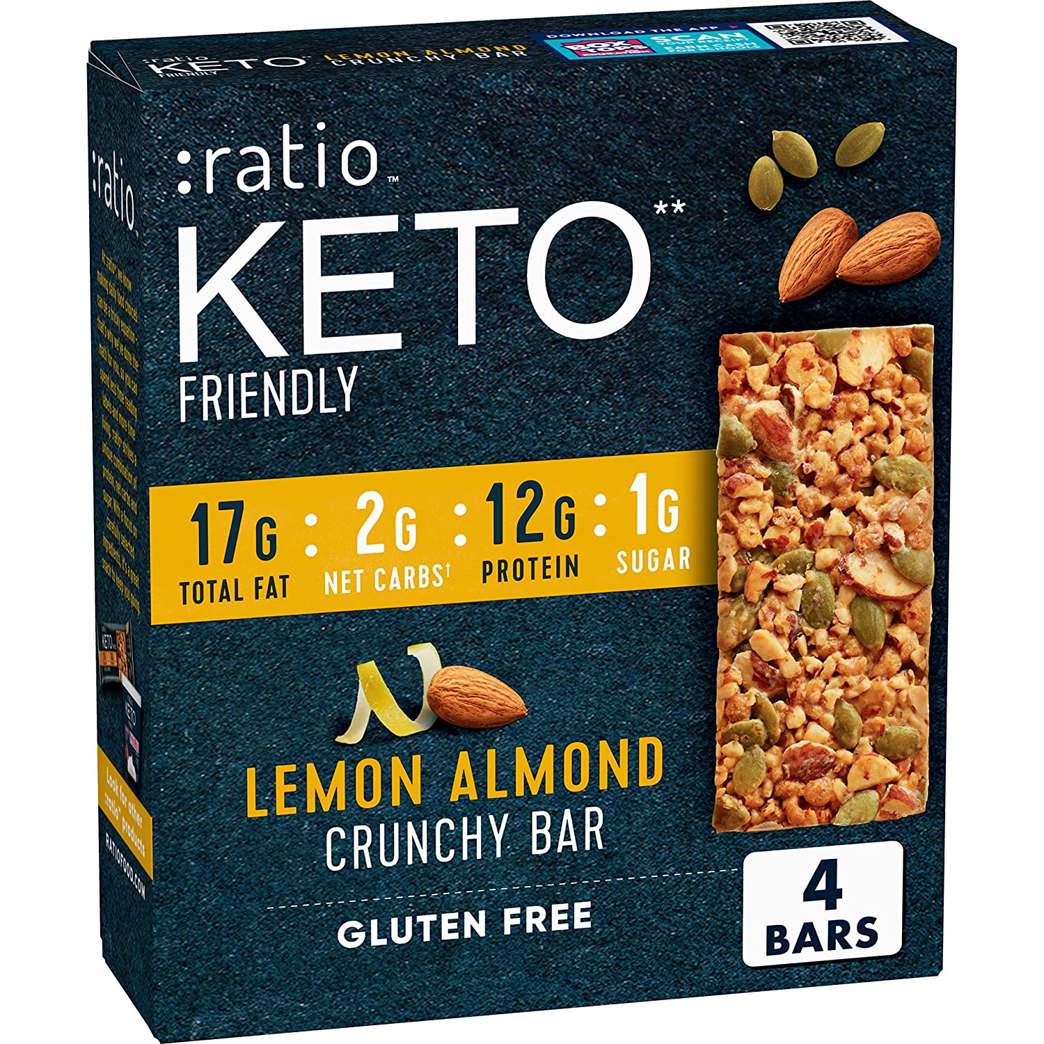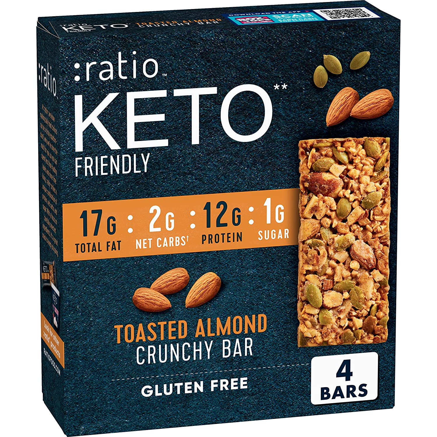 :ratio Crunchy Bars are a convenient KETO Friendly snack with 2g net carbs, featuring almonds and pumpkin seeds. Available in four delicious flavors: Coconut Almond, Lemon Almond, Vanilla Almond, and Toasted Almond. At :ratio, we know making daily food choices can be a tricky equation – that’s why we’ve done the math for you, so you can spend less time reading labels and more time living. These crunchy bars are gluten-free, keto friendly, low carb, low sugar, and diebetic friendly. With a focus on carefully selected ingredients, :ratio strikes a unique combination of protein, net carbs and sugar to keep you going. Always consult your physician before starting an eating play that involves the regular consumption of high fat foods. See label information for calorie, total fat and saturated fat content. Contains 4 bars in total.