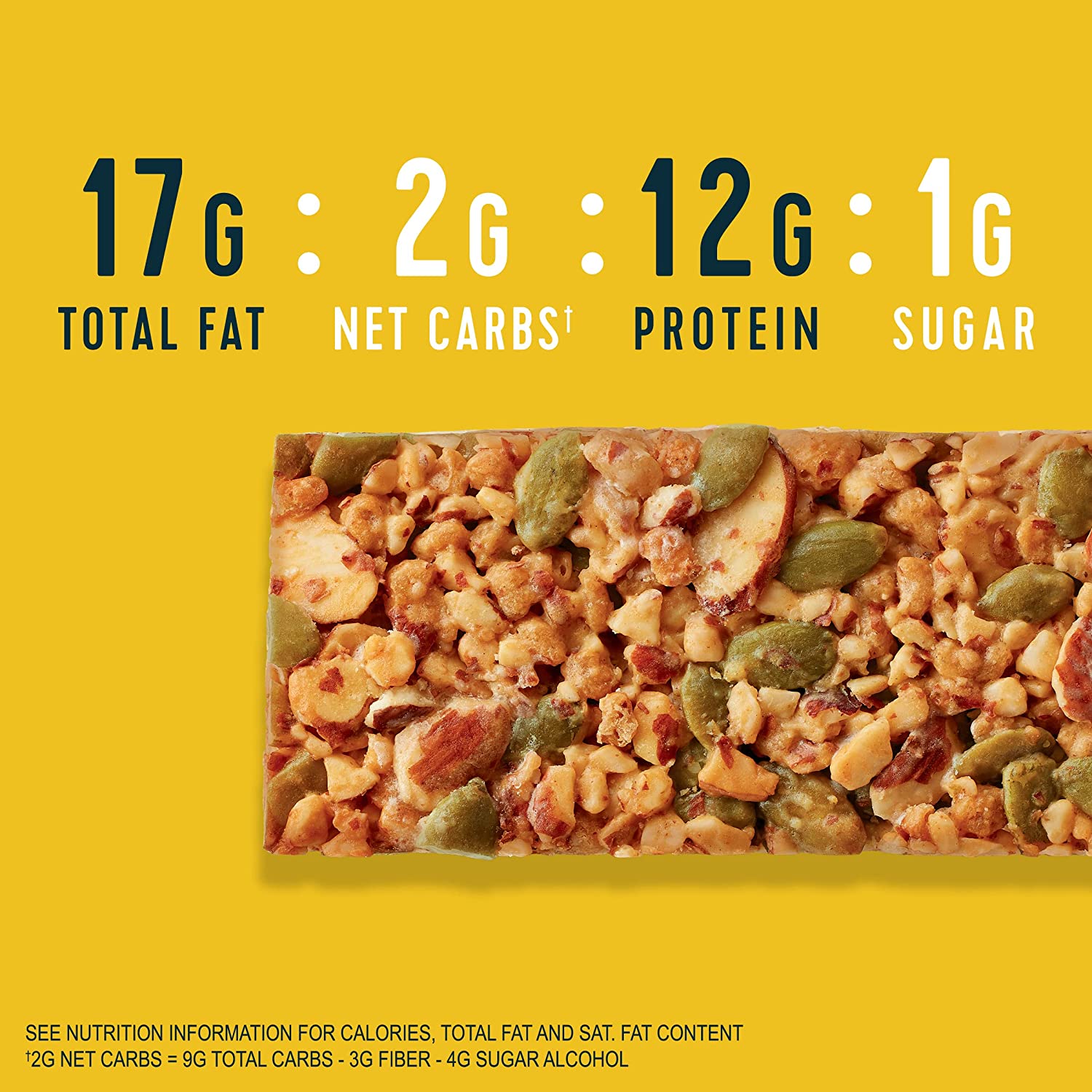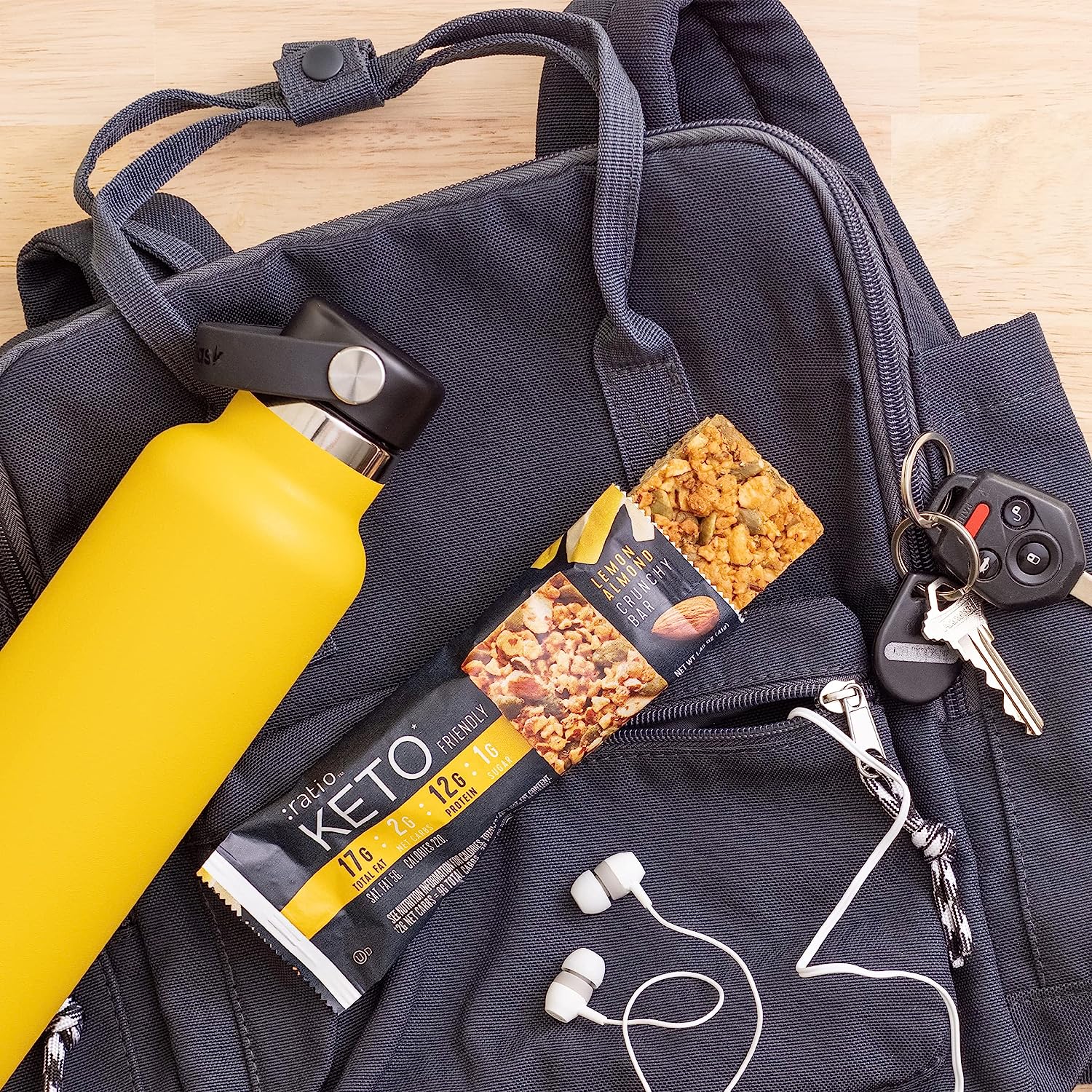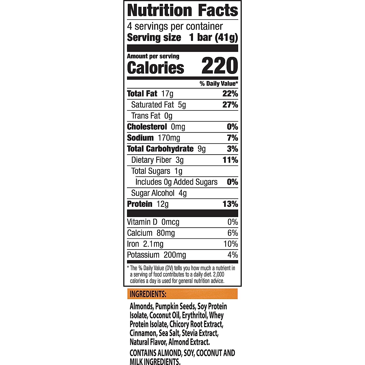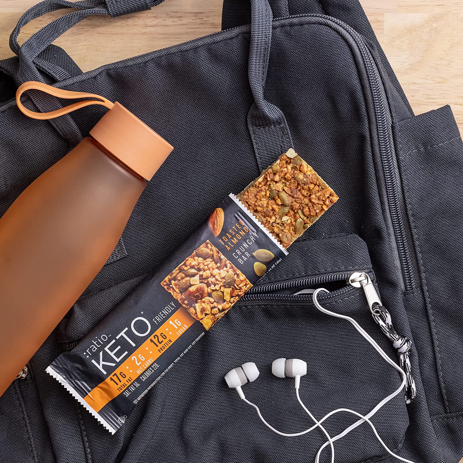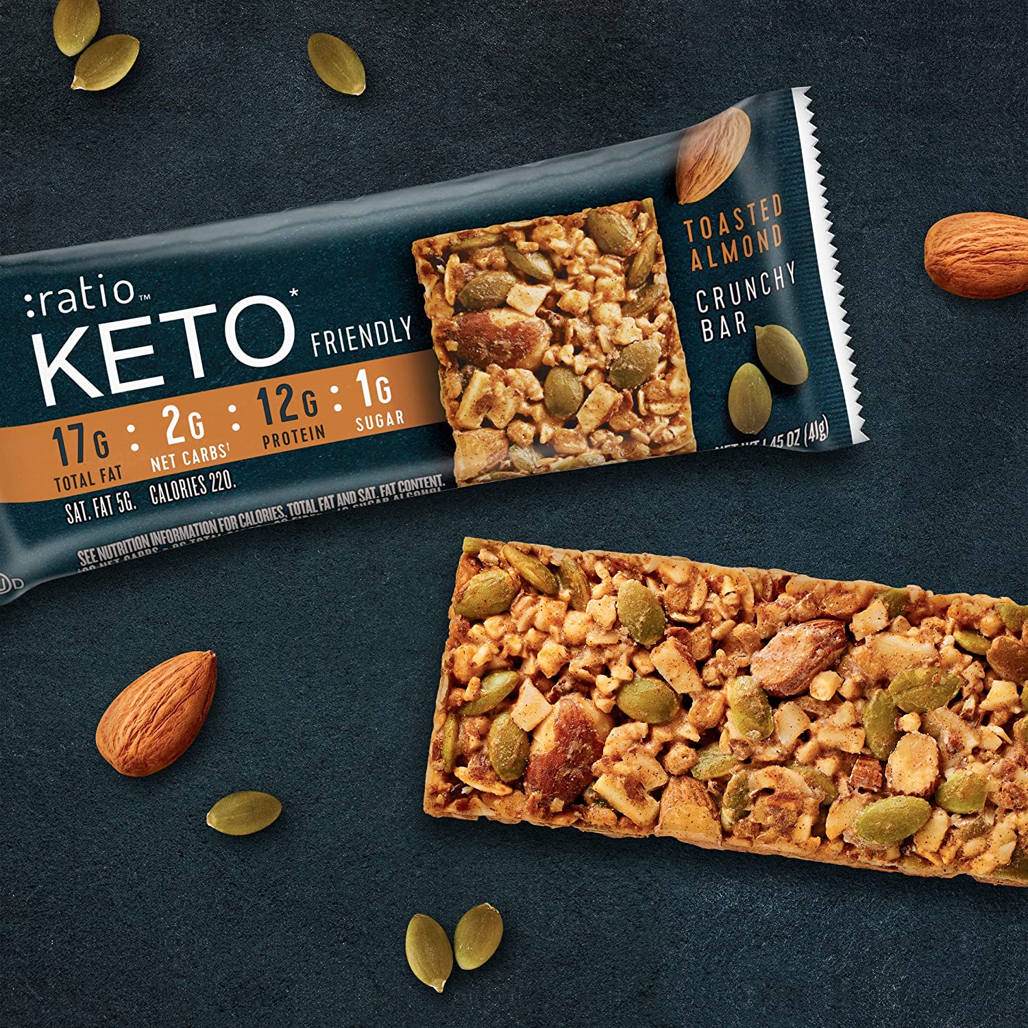 :ratio Crunchy Bars are a convenient KETO Friendly snack with 2g net carbs, featuring almonds and pumpkin seeds. Available in four delicious flavors: Coconut Almond, Lemon Almond, Vanilla Almond, and Toasted Almond. At :ratio, we know making daily food choices can be a tricky equation – that’s why we’ve done the math for you, so you can spend less time reading labels and more time living. These crunchy bars are gluten-free, keto friendly, low carb, low sugar, and diebetic friendly. With a focus on carefully selected ingredients, :ratio strikes a unique combination of protein, net carbs and sugar to keep you going. Always consult your physician before starting an eating play that involves the regular consumption of high fat foods. See label information for calorie, total fat and saturated fat content. Contains 4 bars in total.