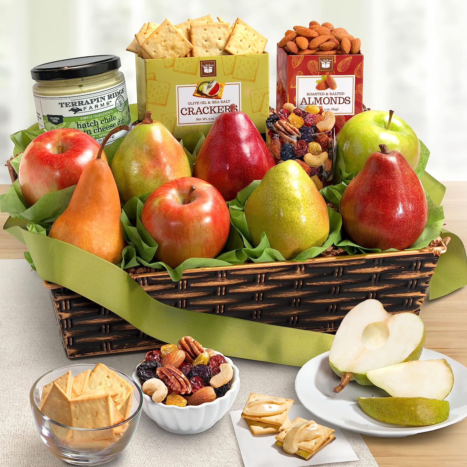 Classic Fresh Fruit Basket Gift with Crackers, Cheese and Nuts for Christmas, Holiday, Birthday, Corporate
