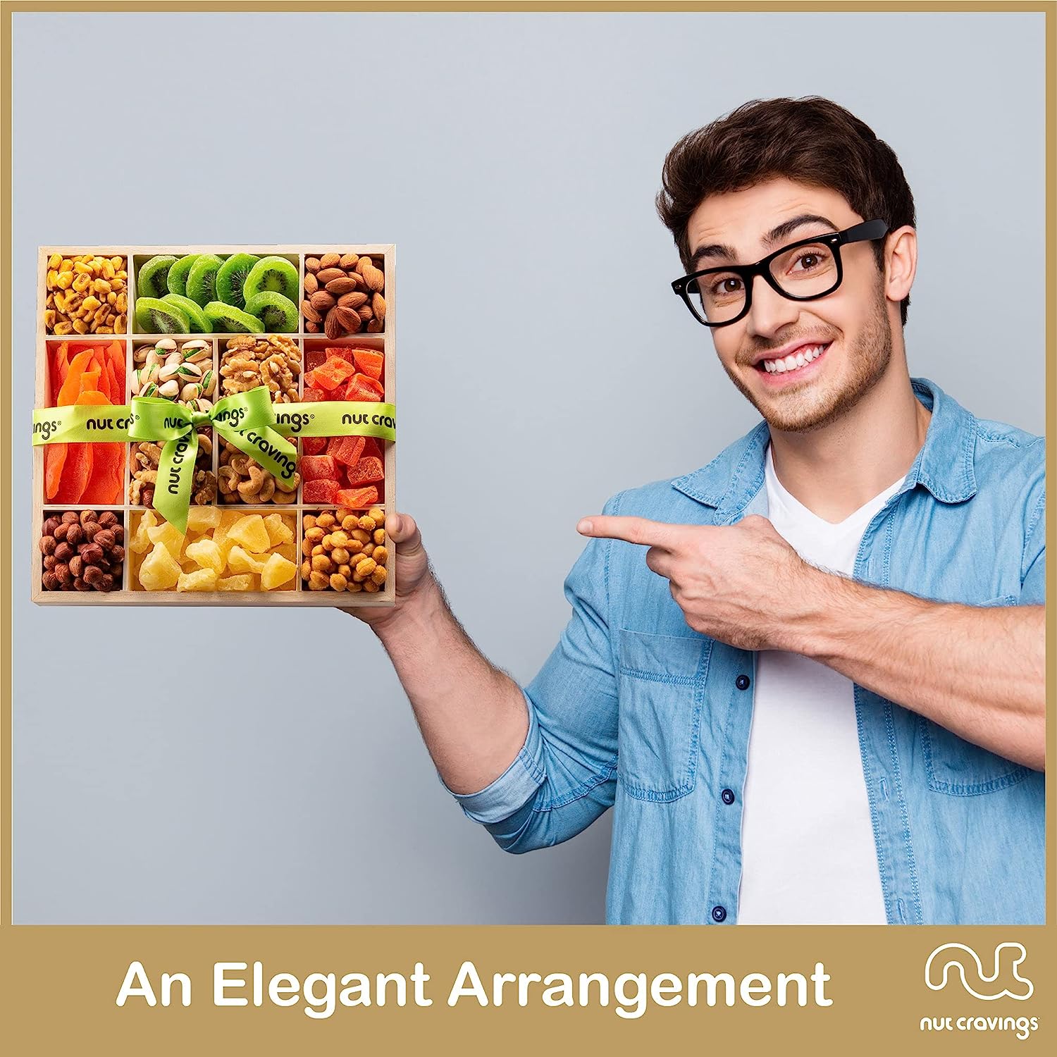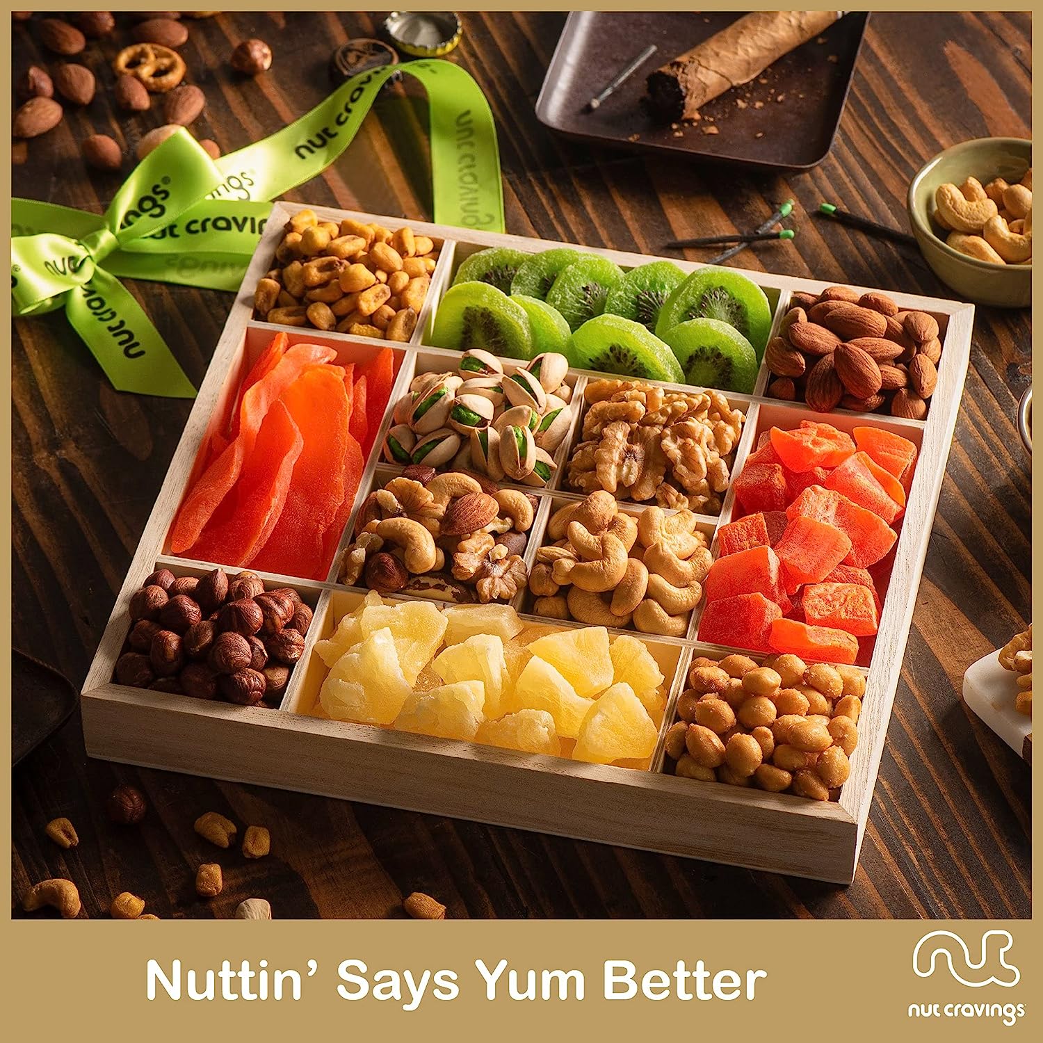 Nut Cravings Gourmet Collection - Dried Fruit & Mixed Nuts Gift Basket in Reusable Wooden Tray + Ribbon (12 Assortments) Food Bouquet Platter, Bday Care Package Healthy Kosher Snack Adults