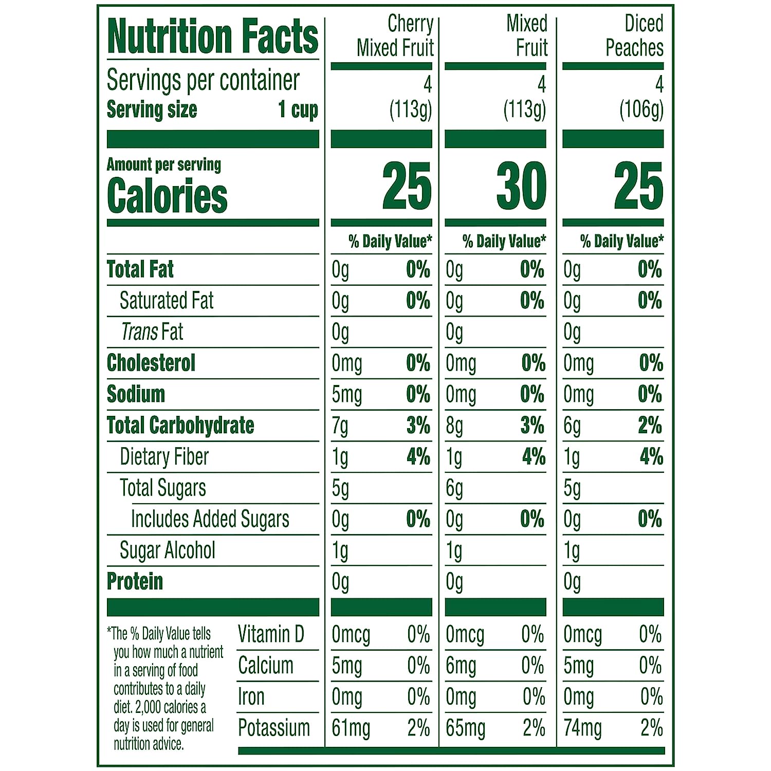 DEL MONTE FRUIT CUP Snacks Family Pack is packed with delicious fruit in naturally sweetened water for a snack you can feel good about. Each fruit cups variety pack contains diced peaches, cherry mixed fruit or mixed fruit, conveniently packaged in easy-to-open individual FRUIT CUP snacks for a quick, on the go snack. Each DEL MONTE fruit snacks variety pack contains no sugar added and is bursting with rich, fruity flavor for a nourishing snack the whole family will love. Enjoy the taste of peaches, pears, pineapple and cherries with every fun spoonful. Easily pack these fruit cocktail variety snacks for a tasty ready to eat fruit snack, or grab a few to take on a weekend trip with the family. Each FRUIT CUP is Non-GMO* and comes in Non-BPA** packaging with an easy peel-off lid for a tasty snack you can say yes to every day. Bring goodness to your family with DEL MONTE fruit cups snacks family size. *Ingredients of the types used in this product are not genetically modified. **Packaging produced without the intentional addition of BPA.