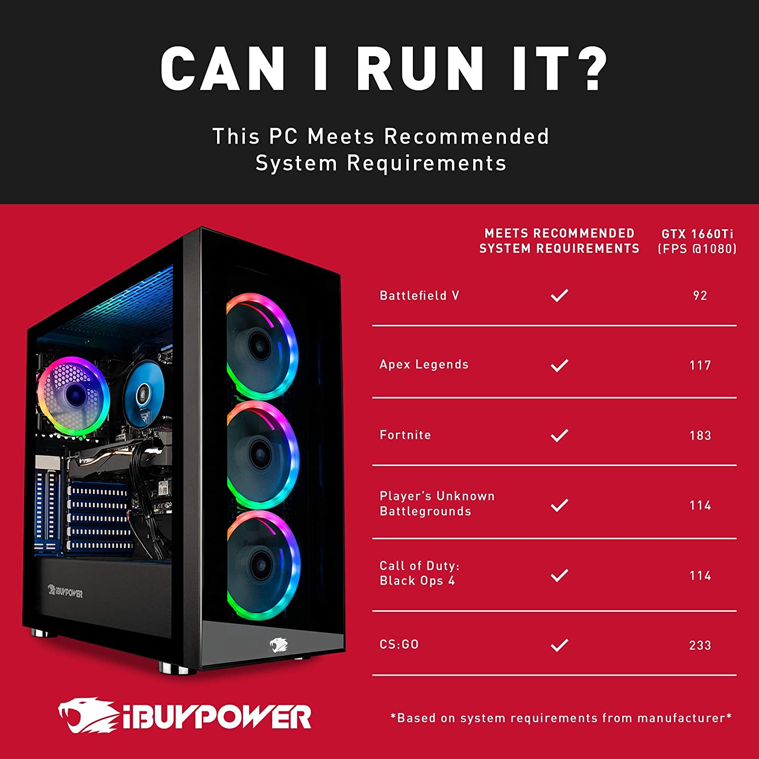 • Special Add-Ons: Tempered Glass RGB Gaming Case | 802.11AC Wi-Fi Included | 16 Color RGB Lighting Case | Free iBuyPower Gaming Keyboard & RGB Gaming Mouse | No Bloatware