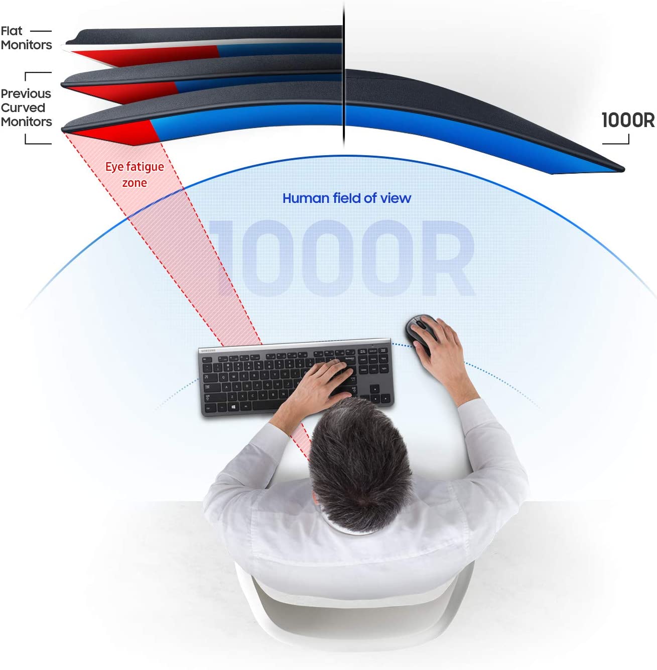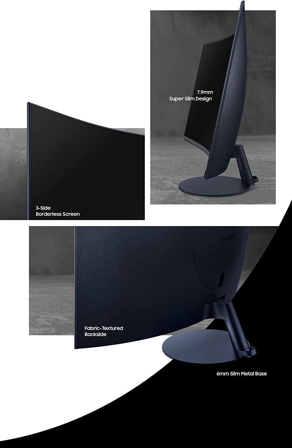 Explore the S39C FHD Curved Monitor with a 1000R* Curvature and advanced eye comfort technology. Its minimalist design features a borderless display, fabric-textured backside and slim metal stand. Game Mode, a 75Hz refresh rate and AMD FreeSync support make playtime as smooth as work time. *'R' is an acronym representing circular radius. The smaller the 'R' value, the deeper the curve.
