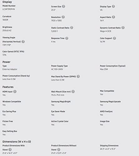 1800R curved monitor with 3000:1 contrast ratio provides a truly immersive viewing experience. Monitor has a tilt range of -2° ~ 20°. Featuring a glossy black finish and ultra slim design, the monitor boasts AMD FreeSync technology and Game Mode which allows users to enjoy smooth images, even during the fastest moving scenes.