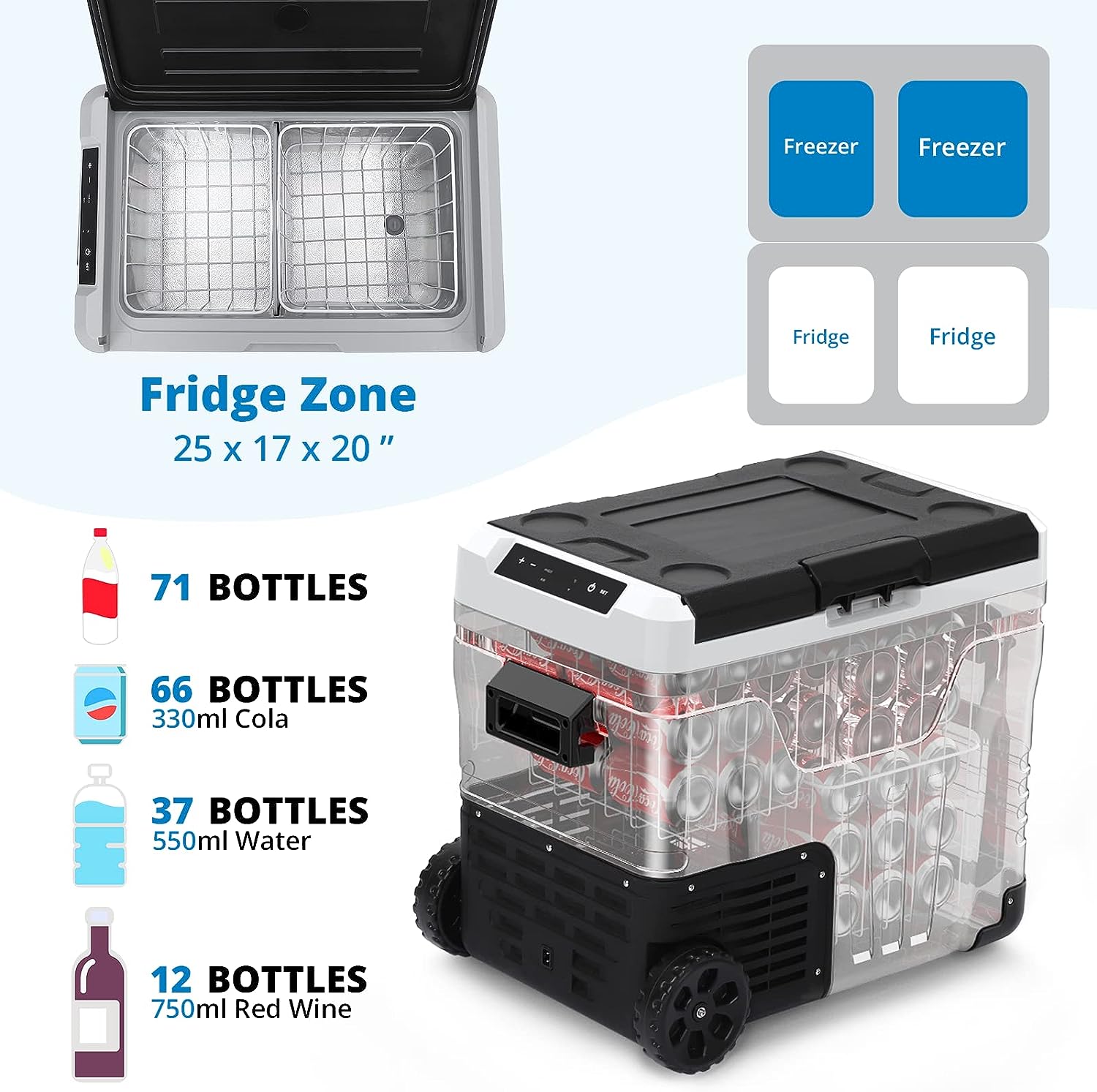 • 【45W Low Power Consumption】Using ECO energy-saving mode, the operating power of this 53 Qt portable refrigerator is less than 45W. Even when running in MAX mode, its intelligent cycle work power consumption is far below 1kwh/day. You can use 12/24V DC power to operate this portable freezer refrigerator on various vehicles, such as SUVs, trucks, RVs, campers, trucks, boats, etc.