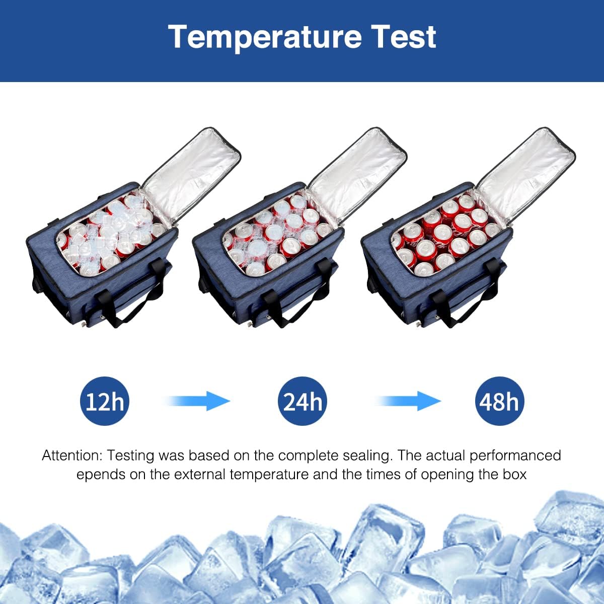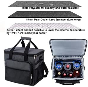 • HIGH QUALITY MATERIAL- The exterior coating is made of 600D polyester. The insulation is made of 15mm polyethylene for great thermal resistance. This cooler maintains a cool 50°F temp without any ice. And in cold winter, the isolation material can help you keep food warm without pluging in electric power.