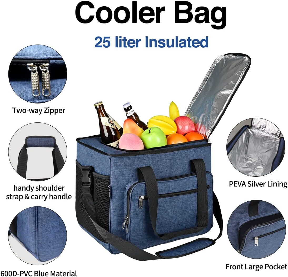 • LARGE CAPACITY- The Cooler bag holds 25 liters (8 gallons) by volume, with a load capacity over 50 pounds, which can hold 34 cans (330ml). It is ideal for camping, hiking, beach BBQs, team building etc.