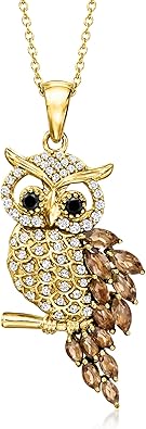 Ross-Simons 1.00 ct. t.w. Smoky Quartz, .50 ct. t.w. White Zircon and .10 ct. t.w. Black Spinel Owl Pendant Necklace in 18kt Gold Over Sterling. 18 inches