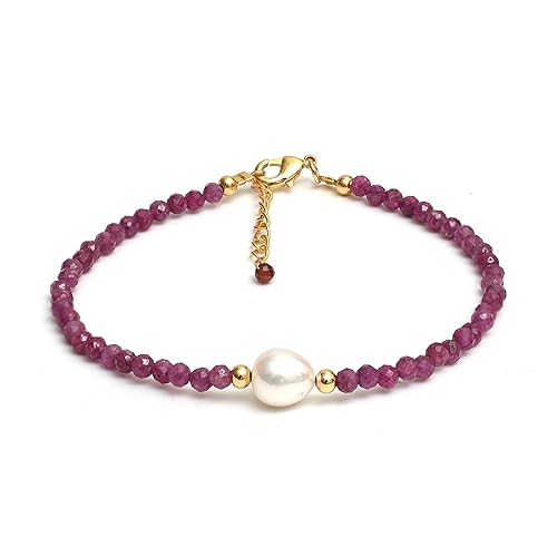 Gempires Natural Ruby Beads Bracelet with Freshwater Pearl, July Birthstone Gemstone Beaded Bracelet, Evening Party Wear Jewelry, 6.5 + 1 Inch 14k Gold Plated Adjustable Chain