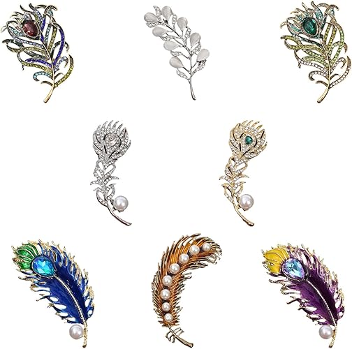 8pcs Ucubwfu Feather Brooch Set, Enamel Rhinestone Premium Brooch, Feather Pins Clothes Bag Jewelry