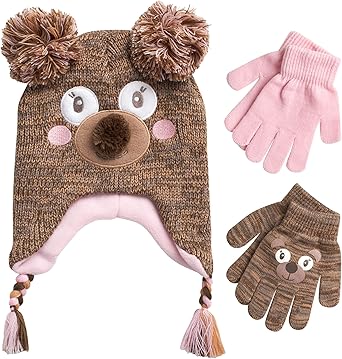 ABG Accessories Girls Critter Winter Hat and 2 Pair Gloves or Mittens (Toddler/Little Girls), Size Age 4-7, Bear 4-7