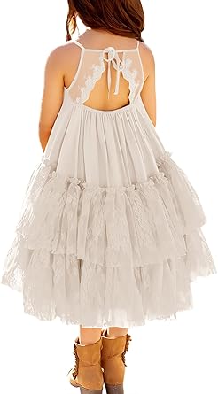 MITILLY Girls Boho Lace Backless Square Neck Sleeveless A Line Ruffle Tiered Flowy Long Party Dress