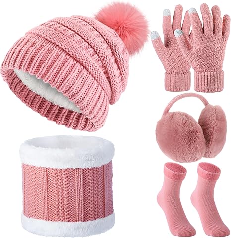 5 Pieces Women Winter Ski Outing Set, Knit Hat Scarf Gloves Earmuffs Stockings