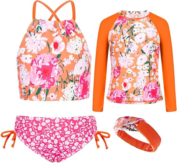 GRACE KARIN Girls Swimsuit Tankini Set Rash Guard Long Sleeve Swimsuit 4 Piece Bathing Suit Swimwear 5-14Y