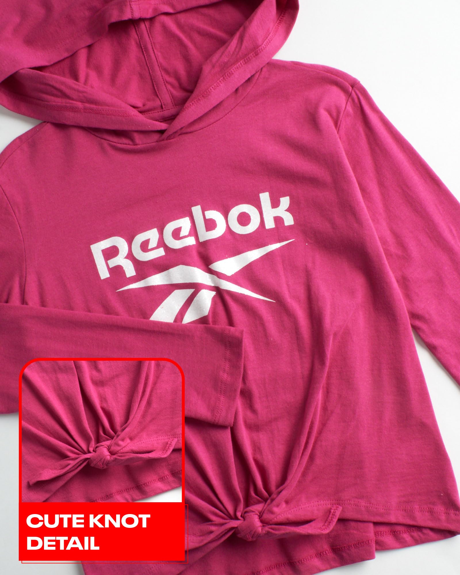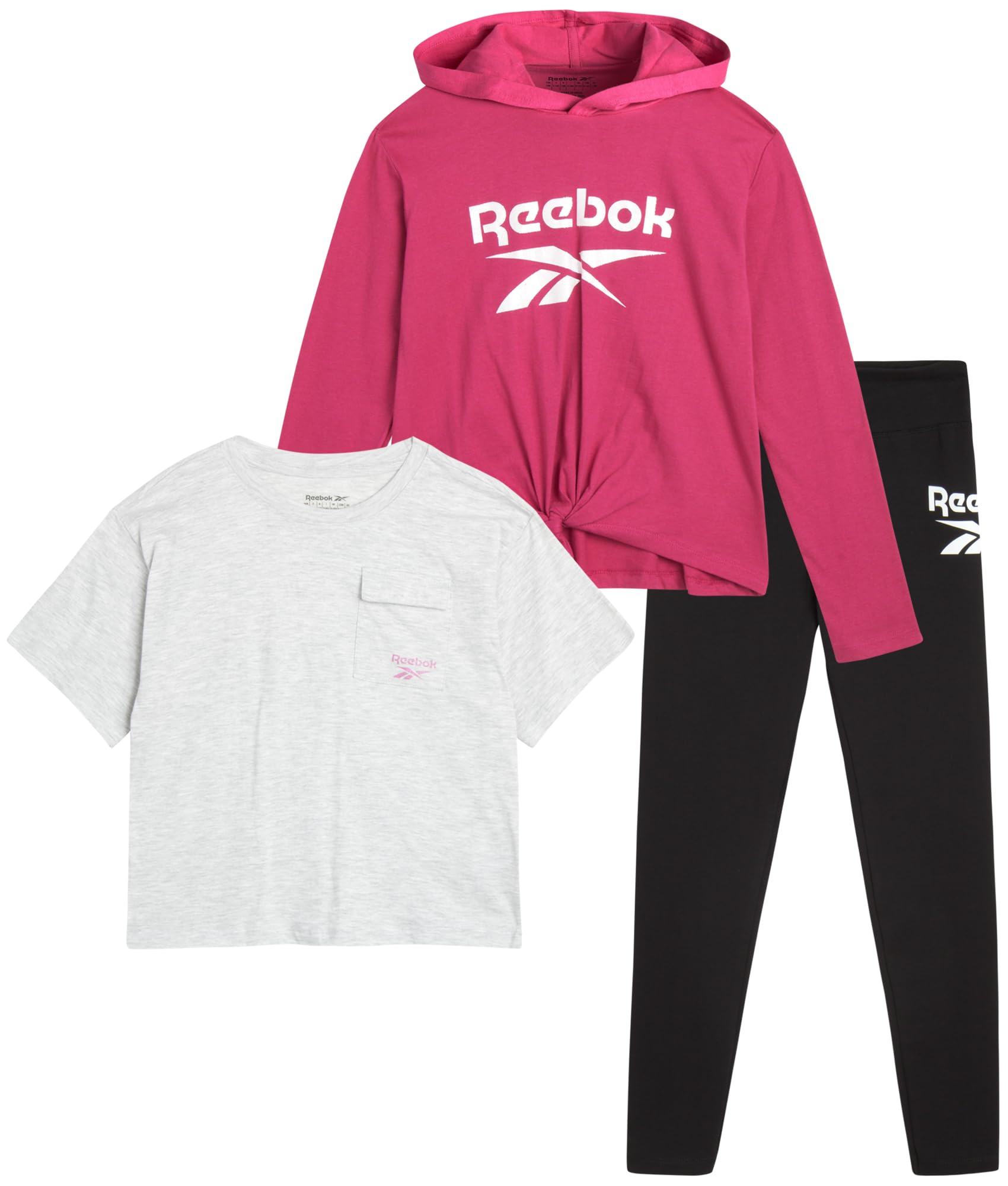 Details: Reebok Girls' Fleece Hoodie, T-Shirt, and Leggings Athleisure Pant Set is the perfect choice for your young lady's first sportswear. The athletic set is made of high-quality, breathable, and super-soft materials to keep her nice and cozy. The fun shirt, comfy fleece hoodie, and stylish leggings make a great outfit for any occasion. Extra Soft - This breathable fabric feels as smooth as it looks and is perfect for sports or lounging. Convenient - The elastic waist bottoms and slip-on tops are as easy to care for as they are to wear. Perfect fit - Designed to keep your toddler snug and comfy while giving her the freedom of movement she needs. Cute Designs - The sporty design, cute colors, and Reebok logo print look great at school or on the playground. Easy to Clean - Simply machine wash and tumble dry; Please Reference the Variations for all Available Sizes and Colors.