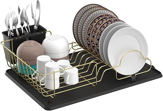 Buruis Dish Drying Rack, Gold Dish Drainer with Anti-Slip Rubber Feet Organizer Includes Removable Drain Board and Utensil Holder, Large Capacity Stainless Steel Dish Racks for Kitchen (Black)