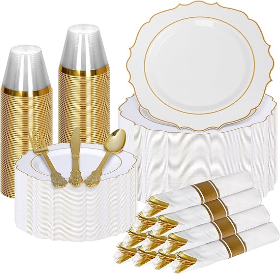 Elegant Gold Plastic Dinnerware Set (350 Pcs) - Includes 50 Dinner Plates, 50 Dessert Plates, 50 Napkins, 50 Cups & Gold Silverware. Ideal for Weddings, Parties & Events. (Modern)