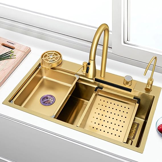 29.5"’ã17.7" Gold Nano Kitchen Waterfall Sink, Single Bowl Stainless Steel Workstation Sink With Multi-function pull-out Faucet Integrated and Accessories