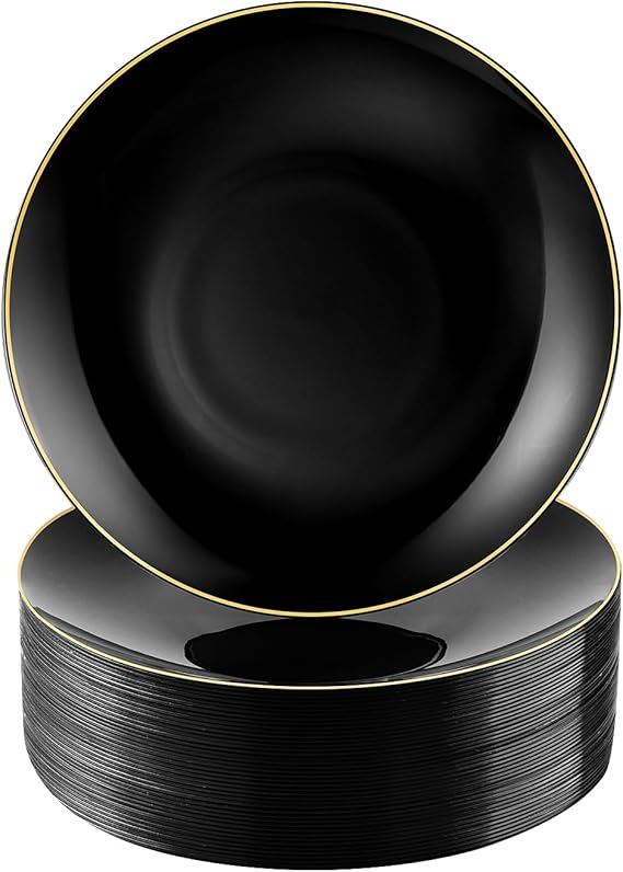 100PCS Black and Gold Plastic Plates, 7.5inch Black Disposable Dessert Salad Plates with Gold Rim, Black Pastic Dinner Plates for Party Wedding