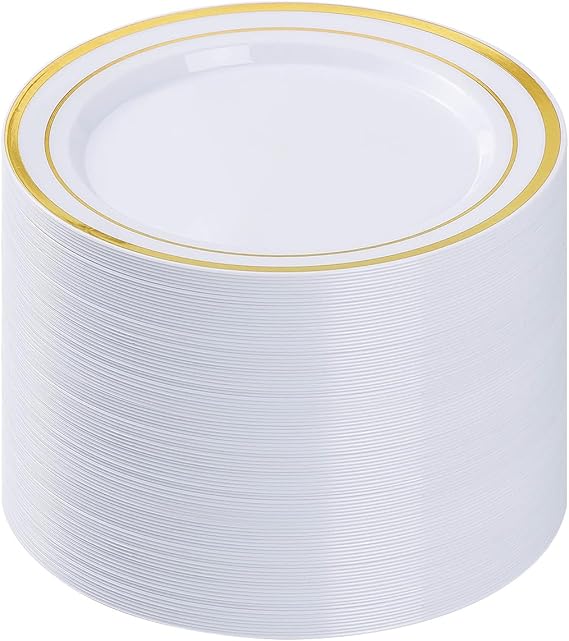 100PCS Gold Plastic Plate, 7 Inch Disposable Dessert Plate Party with Gold Rim, Heavy Duty Disposable Plastic Plates for Party, Wedding and Birthday
