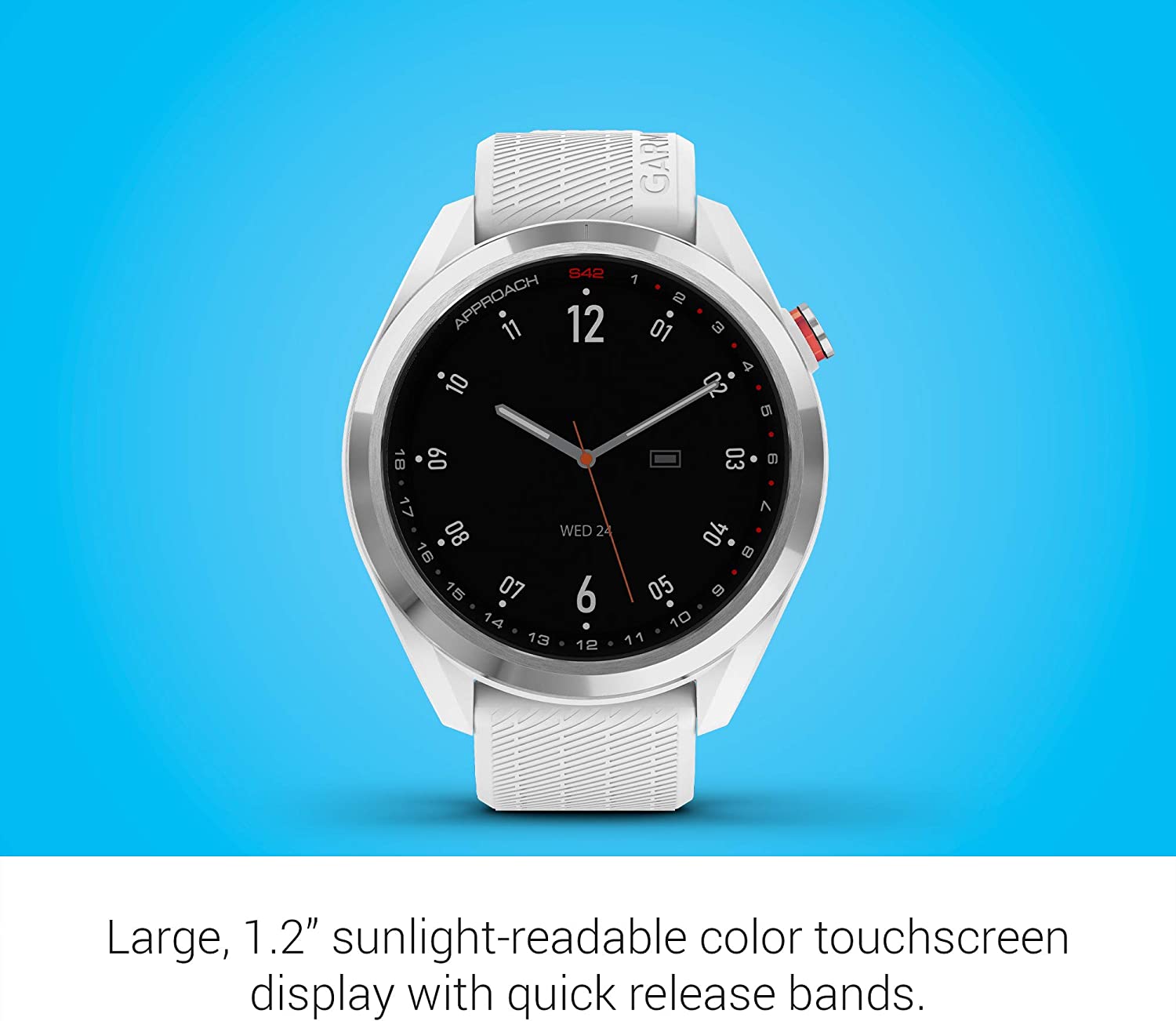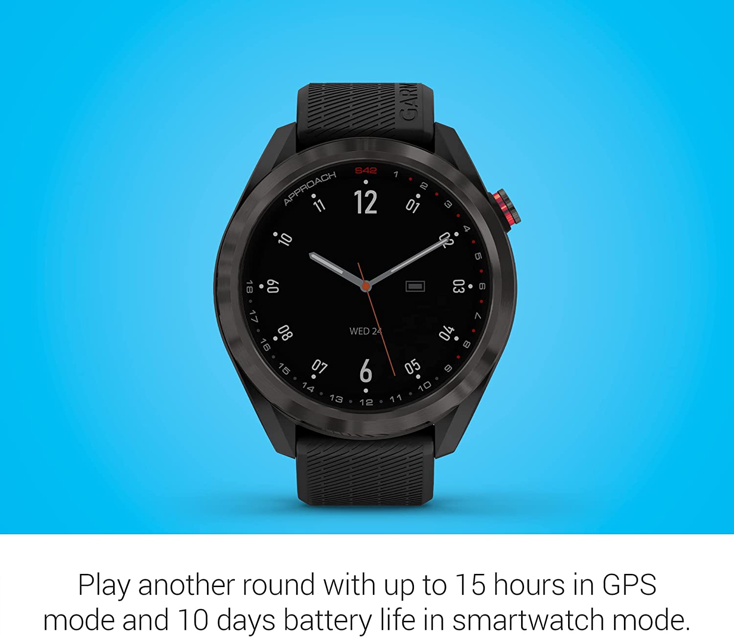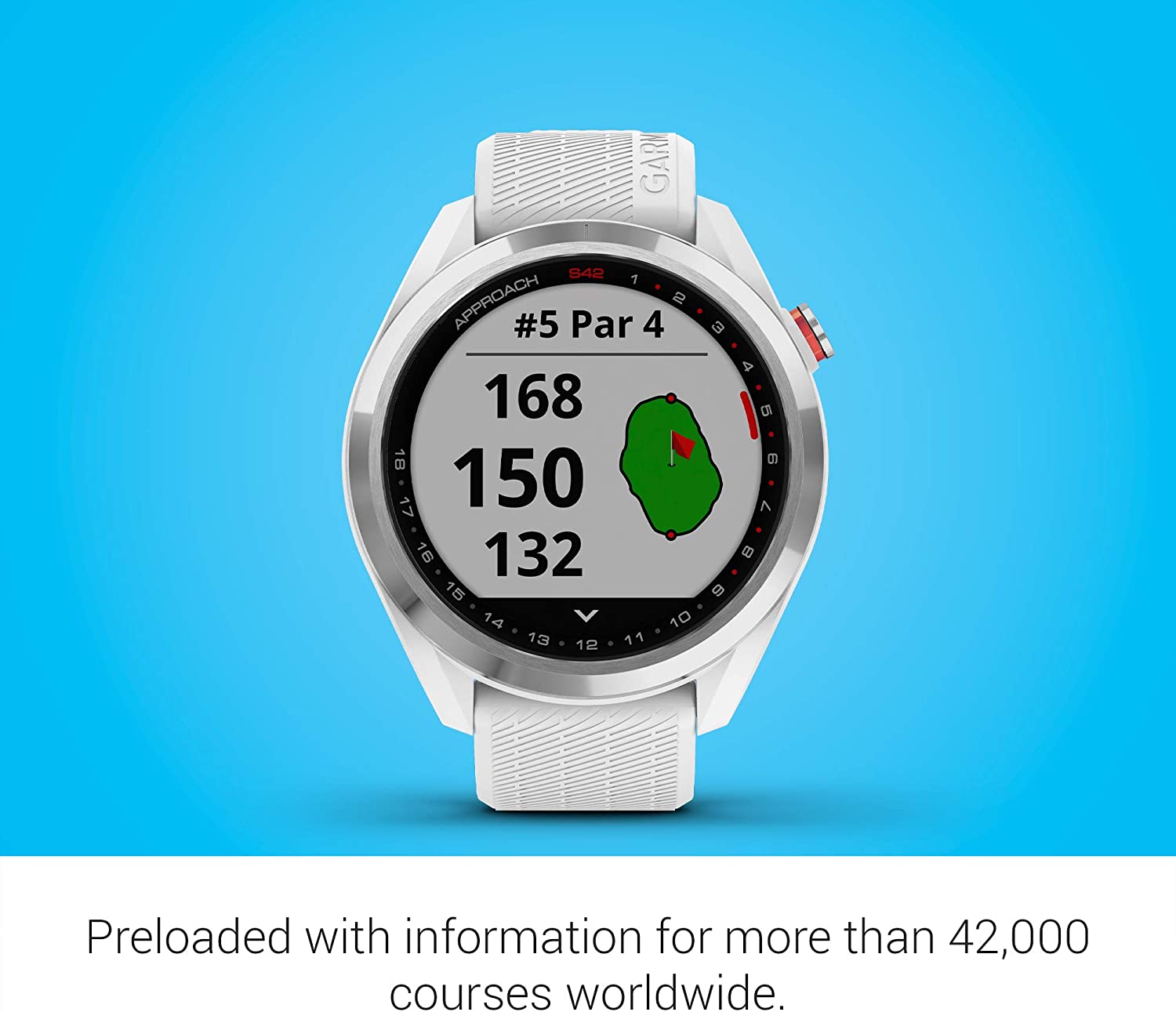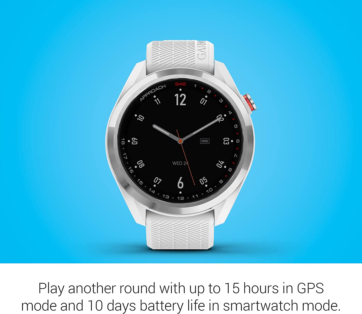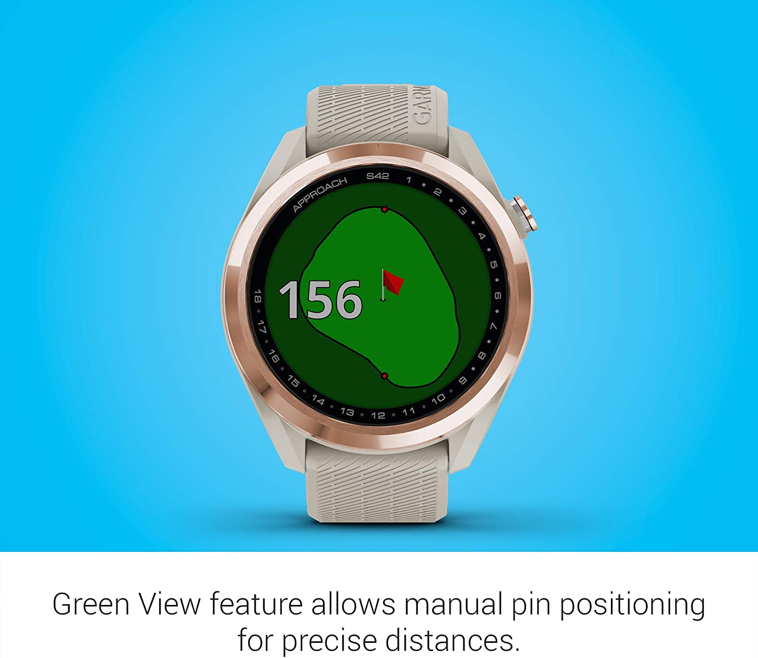 We’ve got your game on and off the course with Approach® S42, a GPS golf smartwatch that puts information from more than 42,000 CourseView maps worldwide on your wrist. The Green View feature allows manual pin positioning so you can quickly reference distances to the front, middle and back of the green as well as hazards and doglegs. The AutoShot round analyzer measures and auto-records detected shot distances (lie and ball contact may affect shot tracking); pair with optional Approach® CT10 club tracking sensors (sold separately) for more automatic game tracking capabilities. Pair with the Garmin Golf™ app (when downloaded on a compatible smartphone) for strokes gained analysis, to participate in leaderboards and tournaments and gain more insights into your game. Wear the watch all day, and get smart notifications (when paired with a compatible smartphone) and estimated activity-tracking features.