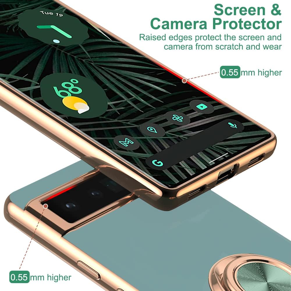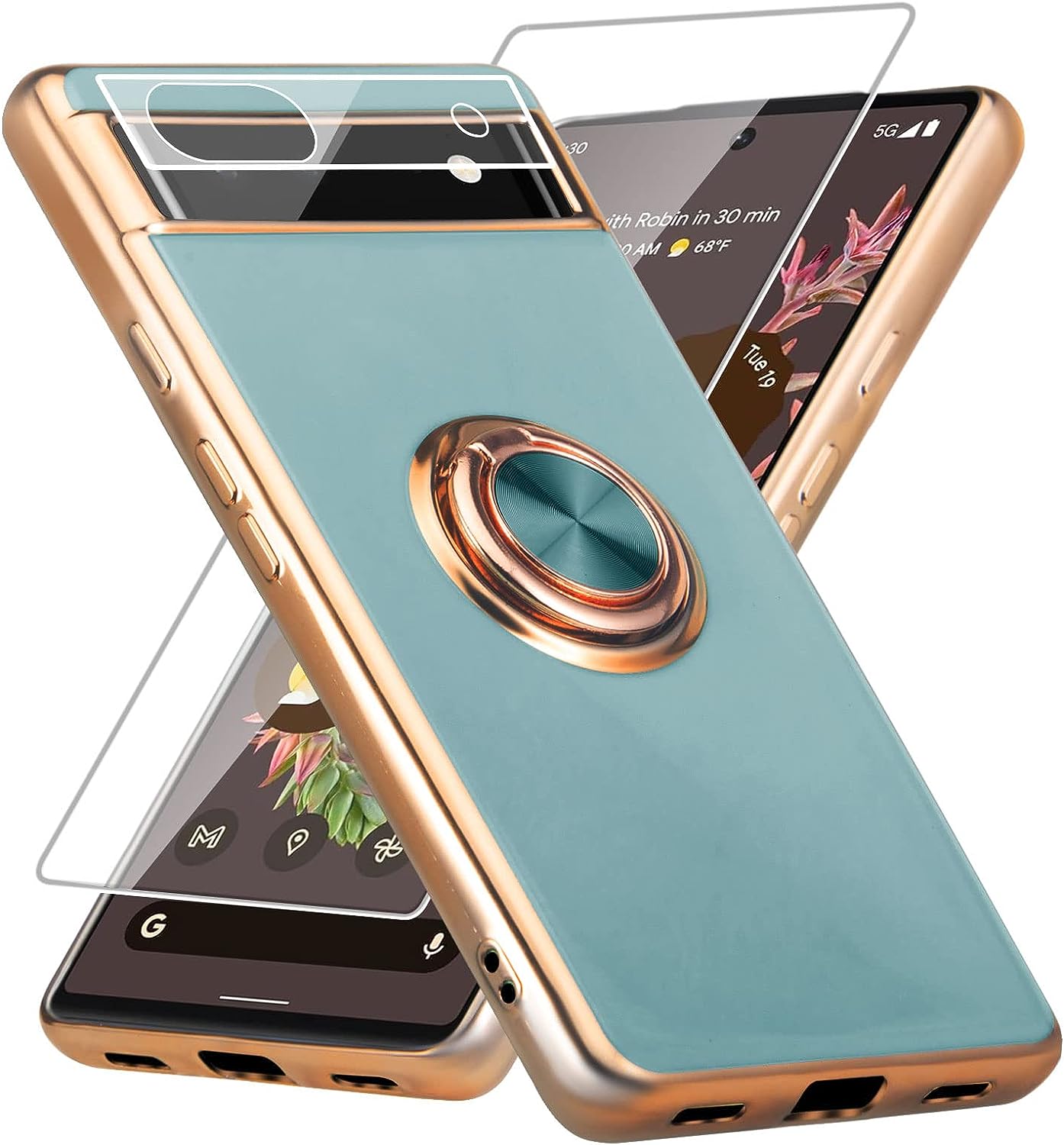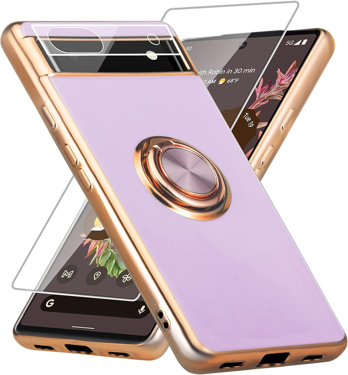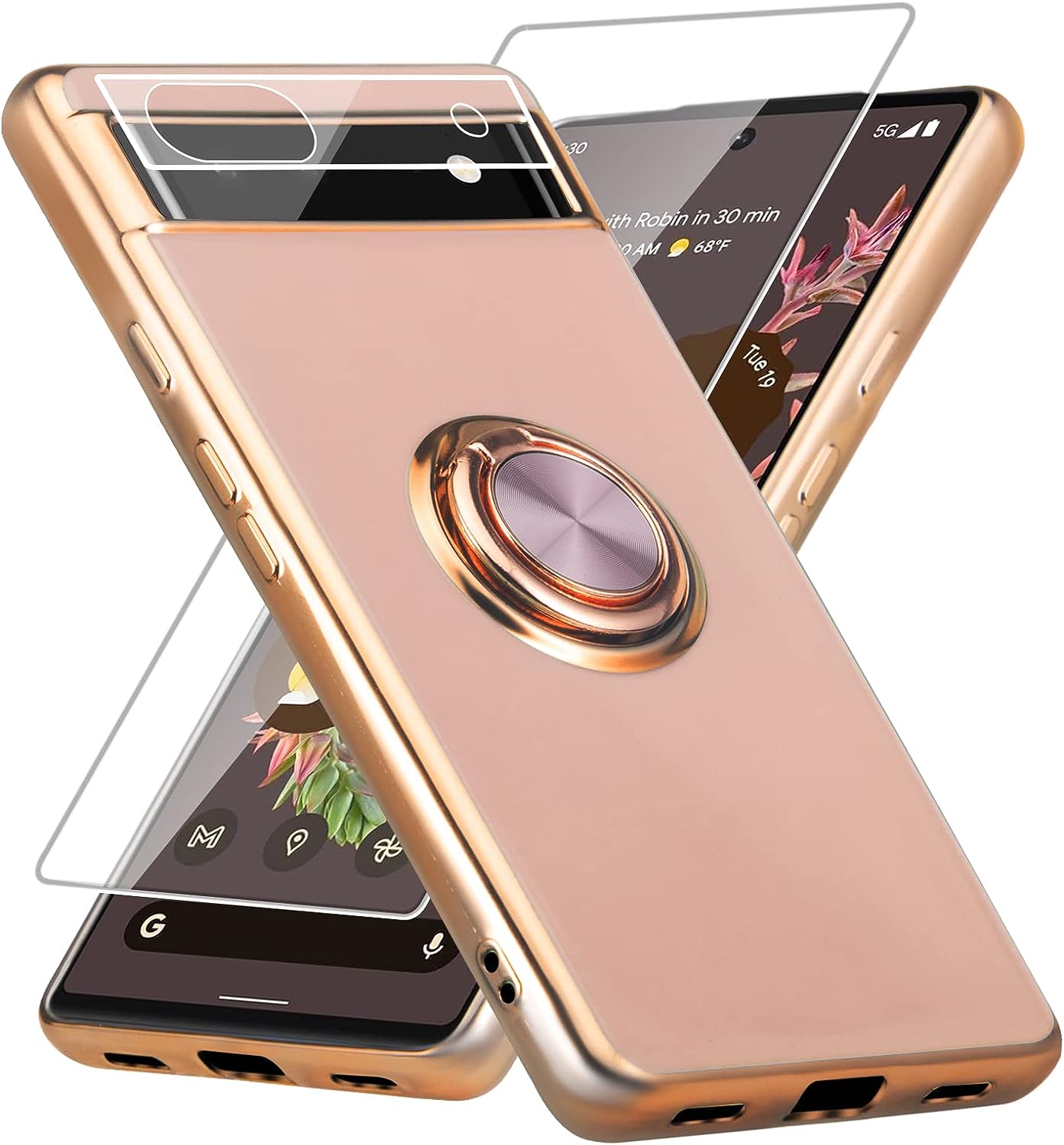 Aitipy for Google Pixel 6A Case, Built-in 360 Rotation Ring Holder with Screen Protector & Camera Lens Protector, Luxury Shiny Electroplated Edged Shockproof Protective Phone Cover (Black/Golden)